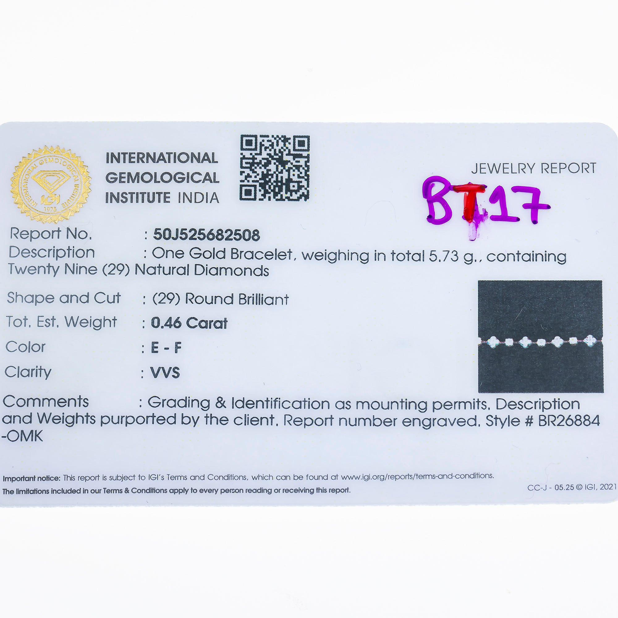 | Delicately designed and meticulously crafted, this 18k rose gold and diamond bracelet from Virani symbolizes modern romance and timeless beauty. Each diamond is set to capture the light, creating a luminous reflection of elegance in diamond jewelry. Features • 18k rose gold • Diamond Specifications • Minimum Width - 1.5 millimeters • Maximum Width - 4.5 millimeters • Length - 6.5 inches • Weight - 5.73 grams Diamond Specifications • Carats - 0.46 • Clarity - VVS • Color - E-F • Cut - Round Brilliant |