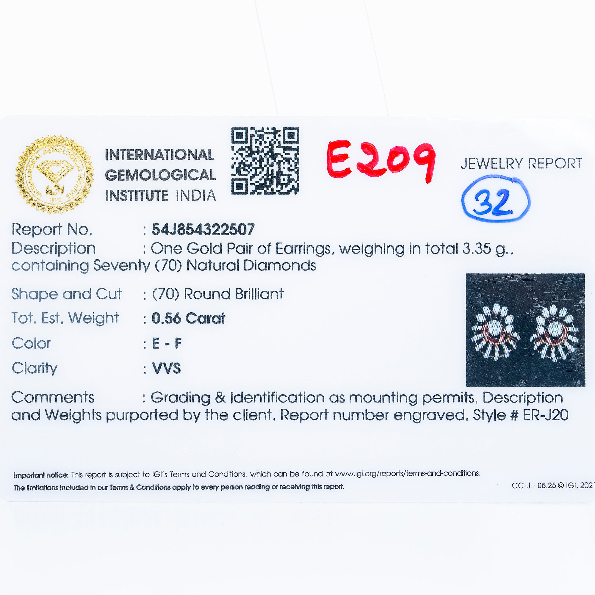 | A celebration of light and luxury, these 18k rose gold and diamond studs by Virani feature intricate patterns and radiant brilliance. Each diamond is delicately set to reflect elegance from every angle, representing the perfect blend of craftsmanship, sophistication, and Indian jewelry design. Features • 18k rose gold • Diamond Specifications • Minimum Width - 1.5 millimeters • Maximum Width - 11 millimeters • Length - 0.5 inch • Weight - 3.35 grams Diamond Specifications • Carats - 0.56 • Clarity - VVS • Color - E-F • Cut - Round Brilliant |