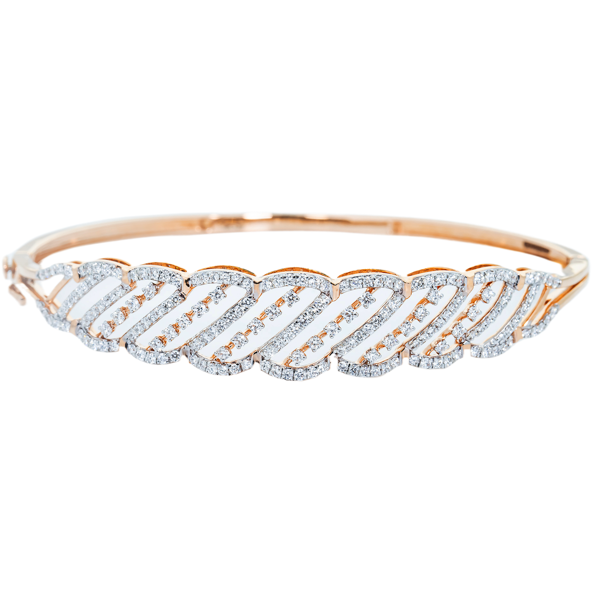 | This 18k rose gold and diamond bracelet by Virani captures modern elegance with classic charm. The luminous rose gold setting beautifully complements the sparkle of each diamond, creating a versatile diamond bracelet for women that celebrates refined style, artistry, and the timeless allure of Indian jewelry. Features • 18k rose gold • Diamond Specifications • Minimum Width - 2.5 millimeters • Maximum Width - 12 millimeters • Length - 2 inches • Weight - 12.2 grams Diamond Specifications • Carats - 1.2 • Clarity - VVS • Color - E-F • Cut - Round Brilliant |