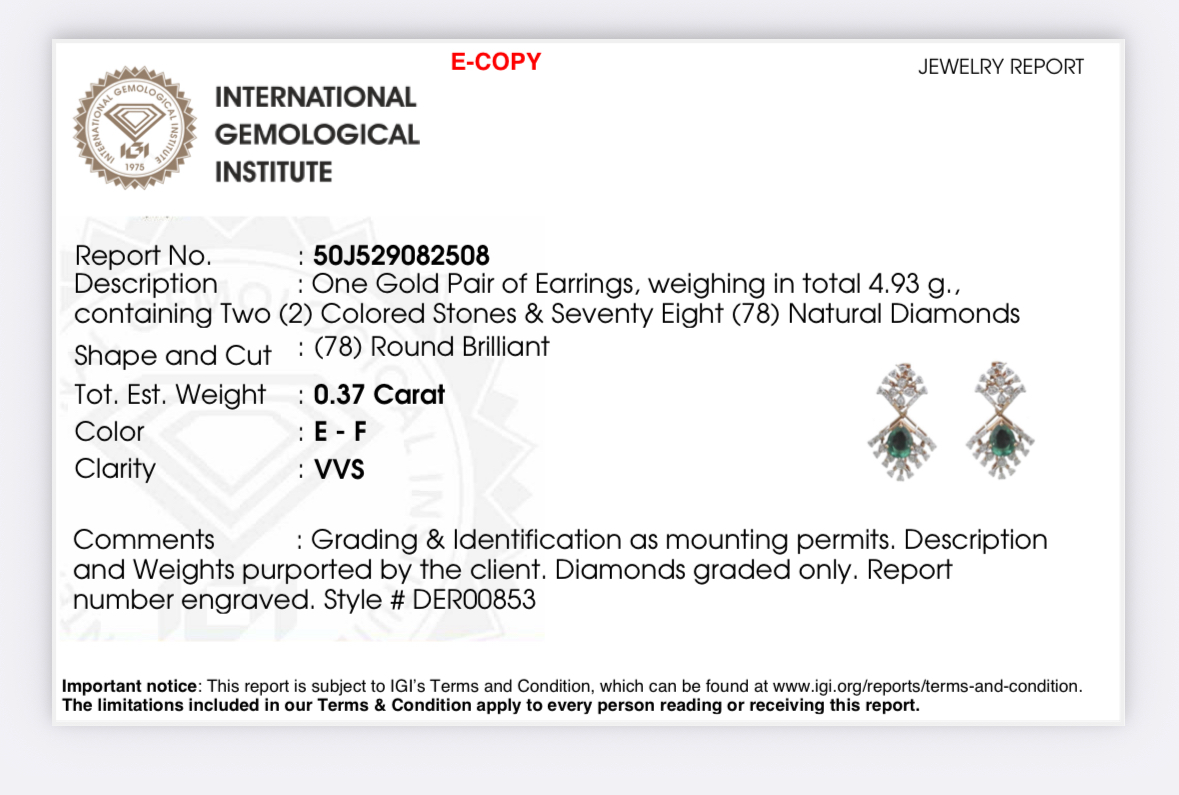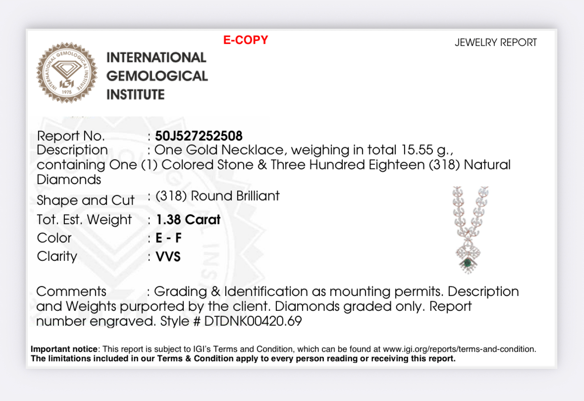 | A symphony of sparkle and sophistication, this 18k rose gold necklace and earring set wth diamond and emeralds by Virani celebrates the beauty of Indian gold jewelry. The stunning assortment of diamonds and emeralds shimmer with unmatched brilliance, delicately set to enhance every movement. Ideal for special occasions or intimate celebrations, this diamond necklace set reflects Virani’s commitment to quality, elegance, and the art of creating Indian jewelry that transcends time. Features • 18k rose gold • Diamond • Emerald Necklace Specifications • Minimum Width - 2.5 millimeters • Maximum Width - 18 millimeters • Length - 18 inches Earring Specifications • Minimum Width - 1.5 millimeters • Maximum Width - 13 millimeters • Length - 0.9 inch Diamond Specifications • Carats - 1.75 • Clarity - VVS • Color - E-F • Cut - Round Brilliant This diamond neclace and earring set has a combined weight of 20.48 grams. |