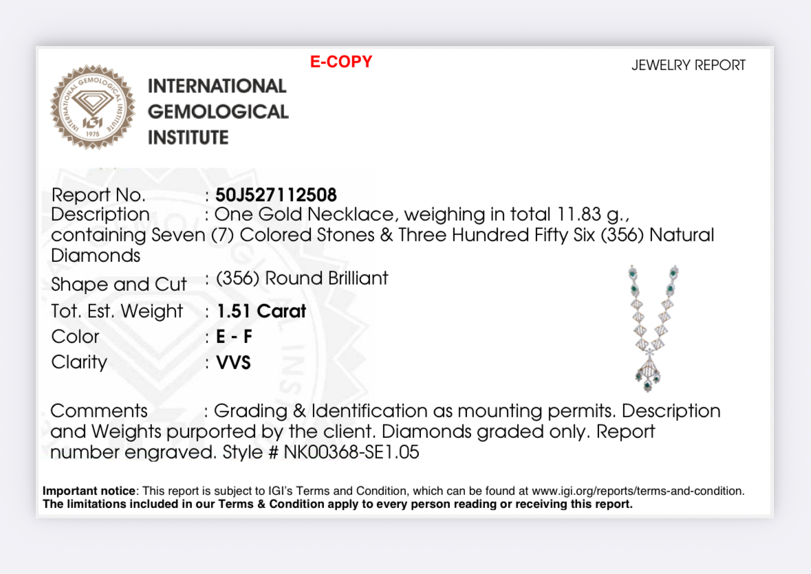 | Refined beauty meets radiant craftsmanship in this 18k rose gold, emerald, and diamond necklace and earring set by Virani Jewelers. Each emeralds and diamond is expertly cut and set to reflect unmatched brilliance, complemented by the soft gleam of rose gold. Designed to elevate any ensemble, this diamond jewelry set embodies Virani’s timeless artistry and celebrates the enduring elegance of Indian jewelry made for modern sophistication and everlasting grace. Features • 18k rose gold • Diamond • Emerald Necklace Specifications • Minimum Width - 3 millimeters • Maximum Width - 18 millimeters • Length - 18 inches Earring Specifications • Minimum Width - 1.5 millimeters • Maximum Width - 11.5 millimeters • Length - 1.25 inches Diamond Specifications • Carats - 1.97 • Clarity - VVS • Color - E-F • Cut - Round Brilliant This diamond neclace and earring set has a combined weight of 18.13 grams. |