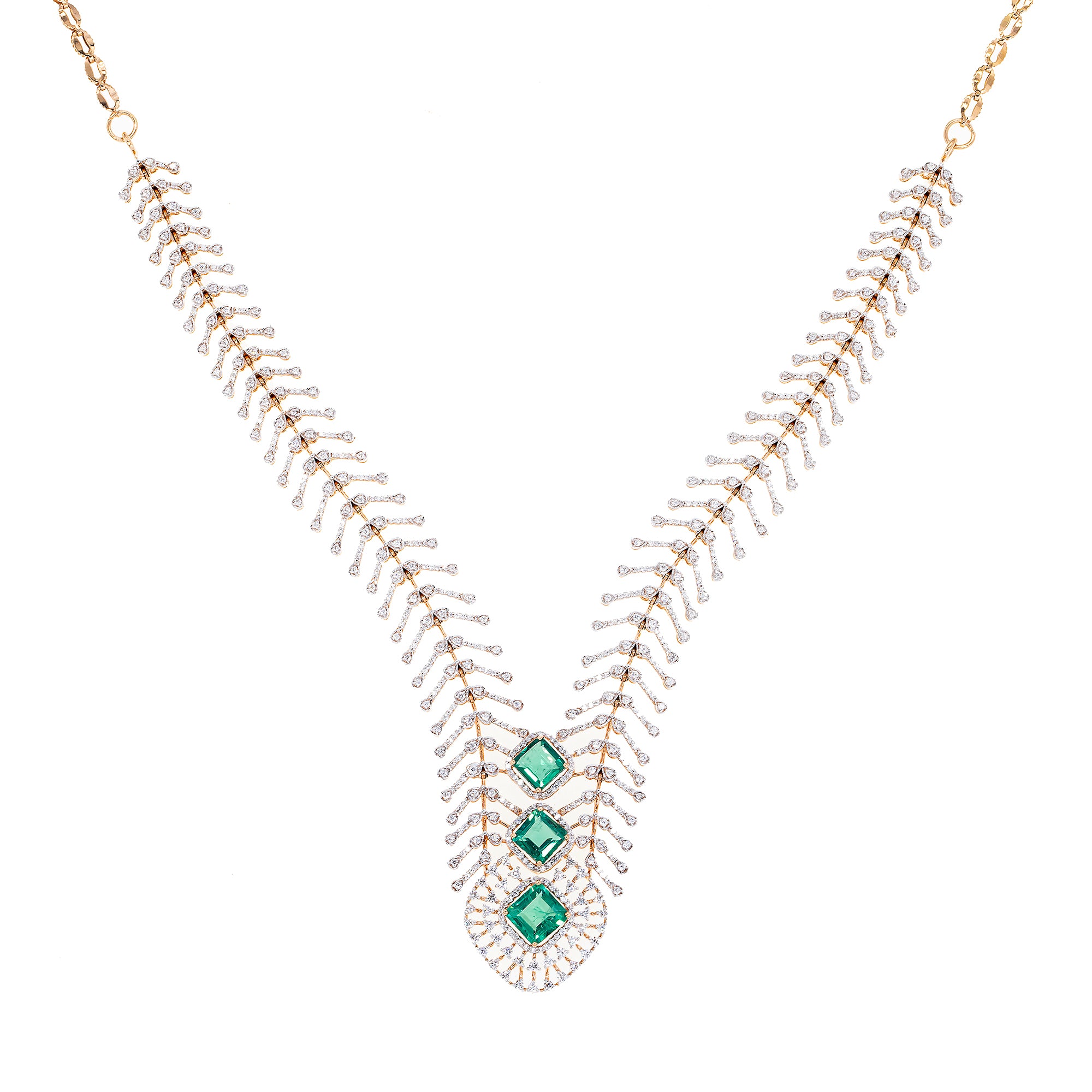 | Grace meets brilliance in this exquisite 18k rose gold, emerald and diamond necklace by Virani Jewelers. Crafted from fine gold and adorned with radiant diamonds and emeralds, it reflects the perfect harmony of modern artistry and timeless allure. Designed to illuminate every occasion, this diamond necklace embodies Virani’s legacy of sophistication, offering a luminous statement of elegance that transcends trends and celebrates the enduring beauty of Indian gold jewelry. Features • 18k rose gold • Diamond • Emerald Specifications • Minimum Width - 2.5 millimeters • Maximum Width - 21 millimeters • Length - 20 inches • Weight - 35.27 grams Diamond Specifications • Carats - 2.56 • Clarity - VVS • Color - E-F • Cut - Round Brilliant |