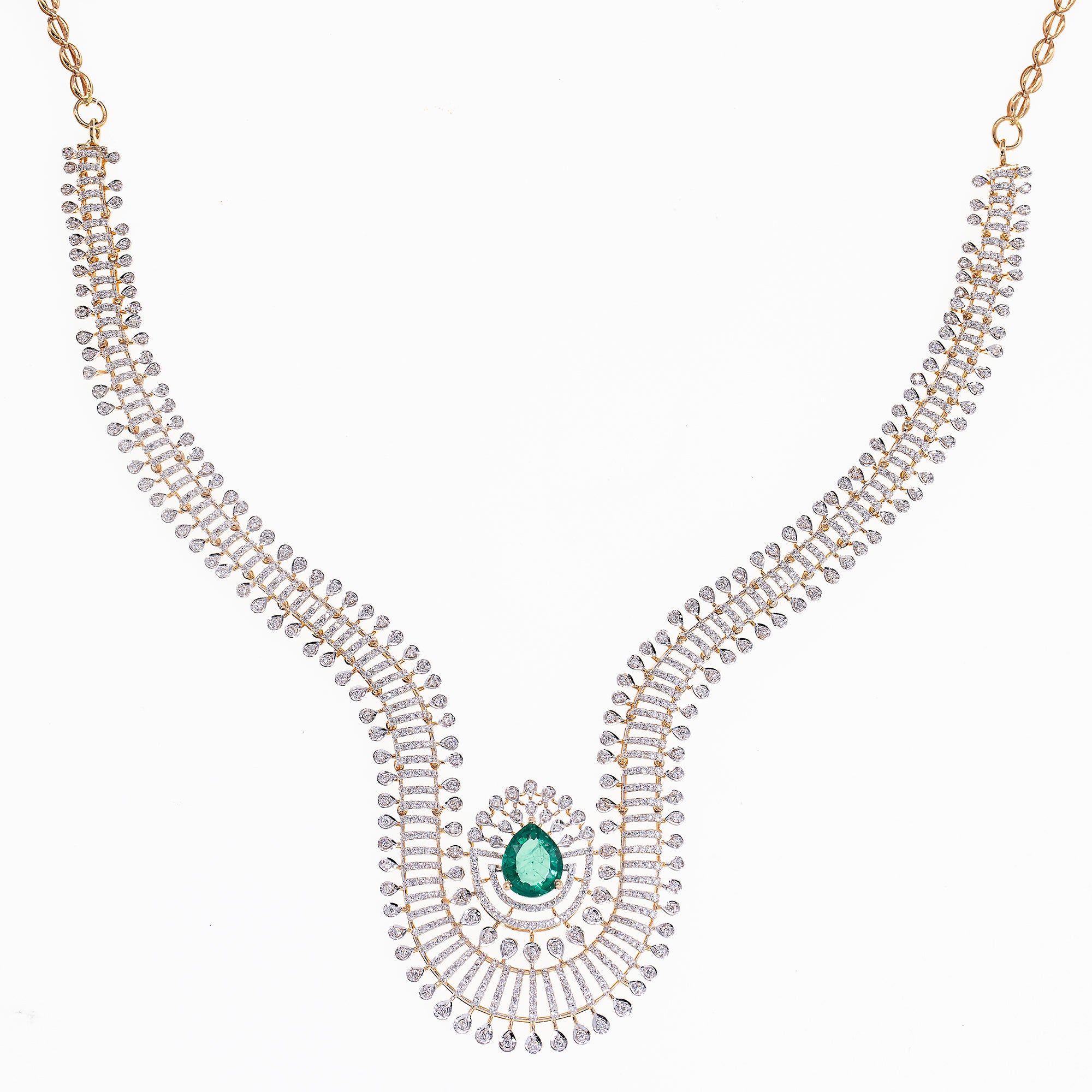 | Illuminate every moment with this 18k rose gold and diamond necklace and earring set with emeralds from Virani Jewelers. Each emralds and diamond is selected for its brilliance, set against radiant rose gold that enhances its natural glow. Perfect for celebrating life’s milestones or elevating a special occasion with elegance, this diamond jewelry set captures the essence of timeless beauty and contemporary refinement, a true reflection of Virani’s luxurious craftsmanship. Features • 18k rose gold • Diamond • Emerald Necklace Specifications • Minimum Width - 2.5 millimeters • Maximum Width - 41 millimeters • Length - 19 inches Earring Specifications • Minimum Width - 1.5 millimeters • Maximum Width - 15 millimeters • Length - 1 inch Diamond Specifications • Carats - 3.9 • Clarity - VVS • Color - E-F • Cut - Round Brilliant This diamond neclace and earring set has a combined weight of 35.16 grams |