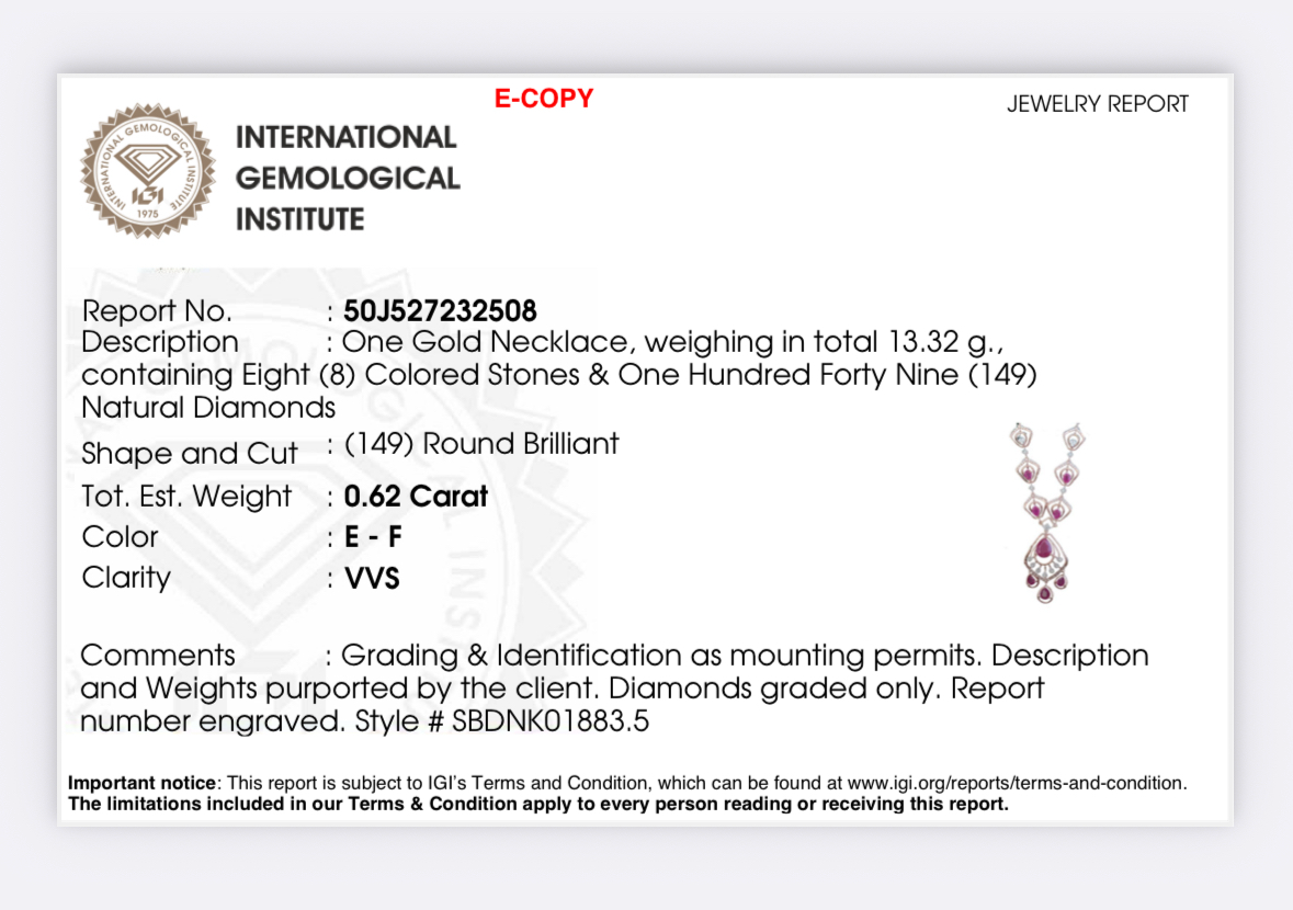 | Elevate your style with this breathtaking 18k rose gold, ruby and diamond necklace from Virani. Crafted with meticulous precision, its rose gold setting enhances the sparkle of each diamond and ruby, creating a luminous statement of grace and luxury. Perfect for celebratory occasions, this diamond necklace embodies the artistry of Indian gold jewelry and reflects the timeless heritage that defines every Virani creation. Features • 18k rose gold • Diamond • Ruby Specifications • Minimum Width -2.5 millimeters • Maximum Width - 18 millimeters • Length - 19 inches • Weight - 13.33 grams Diamond Specifications • Carats - 0.62 • Clarity - VVS • Color - E-F • Cut - Round Brilliant |