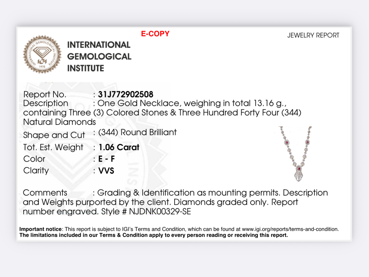 | Radiate with timeless sophistication when you adorn your neck with this 18k rose gold and diamond necklace with rubies by Virani Jewelers. Each ruby and diamond is set in lustrous gold to maximize brilliance and allure. Perfect for elegant evenings or formal occasions, this diamond jewelry set captures Virani’s signature craftsmanship and enduring beauty, offering a luminous statement of grace designed to illuminate every moment with classic yet contemporary elegance. Features • 18k rose gold • Diamond • Ruby Specifications • Minimum Width - 3 millimeters • Maximum Width - 18.5 millimeters • Length - 18 inches • Weight - 13.16 grams Diamond Specifications • Carats - 1.06 • Clarity - VVS • Color - E-F • Cut - Round Brilliant |