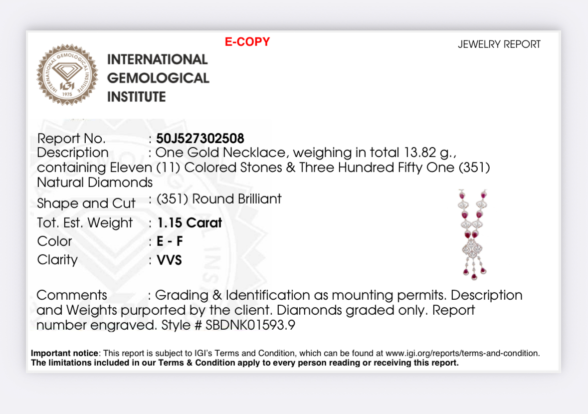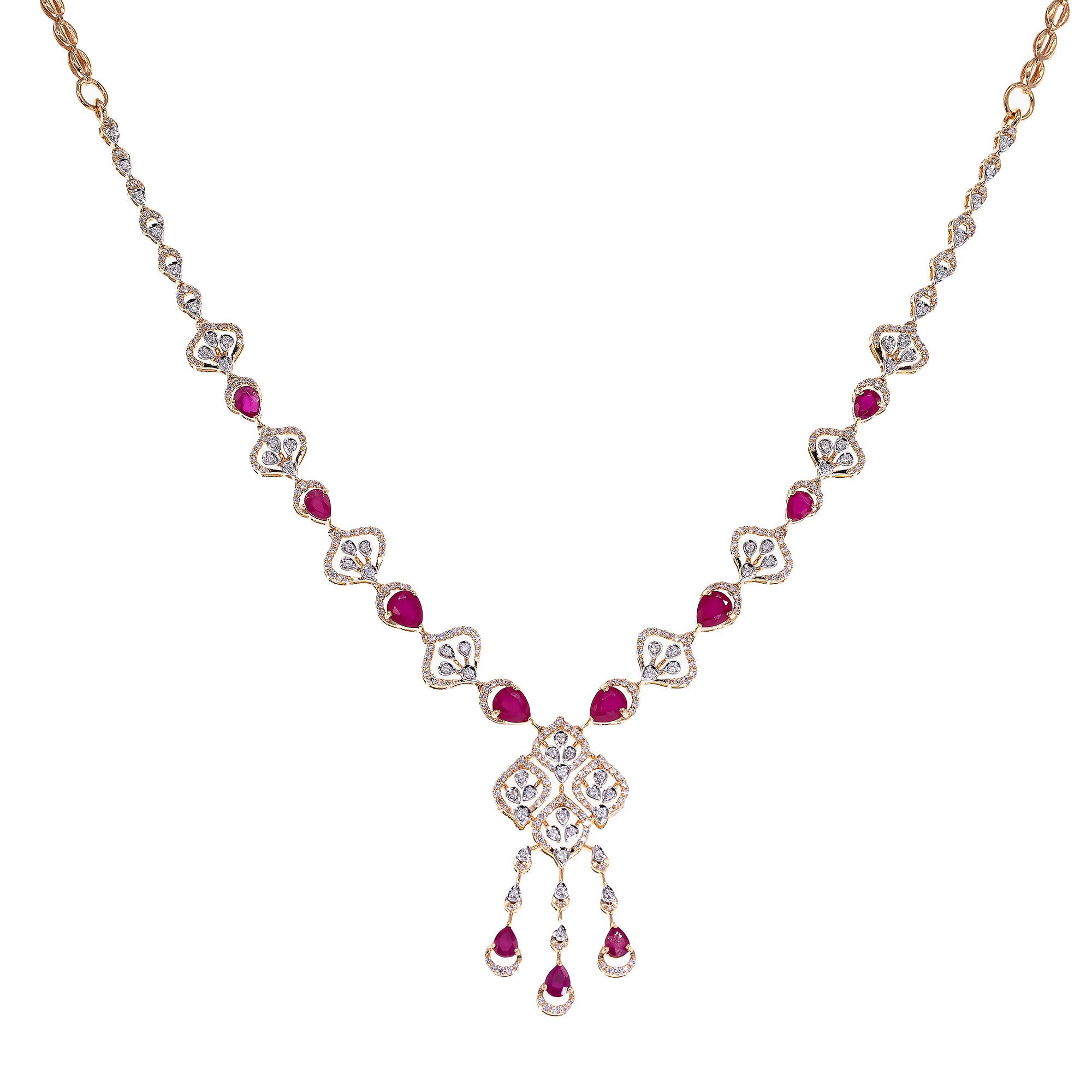Crafted for the modern woman, this 18k rose gold, rbuy and diamond necklace from Virani is a celebration of elegance and luminosity. Each diamond amd ruby is meticulously placed to reflect extraordinary brilliance, framed by the rich warmth of rose gold. Whether styled for an evening occasion or layered for everyday sophistication, this diamond necklace represents Virani’s enduring legacy of luxury and impeccable craftsmanship. Features • 18k rose gold • Diamond • Ruby Specifications • Minimum Width - 3 millimeters • Maximum Width - 17 millimeters • Length - 20 inches • Weight - 13.82 grams Diamond Specifications • Carats - 1.15 • Clarity - VVS • Color - E-F • Cut - Round Brilliant