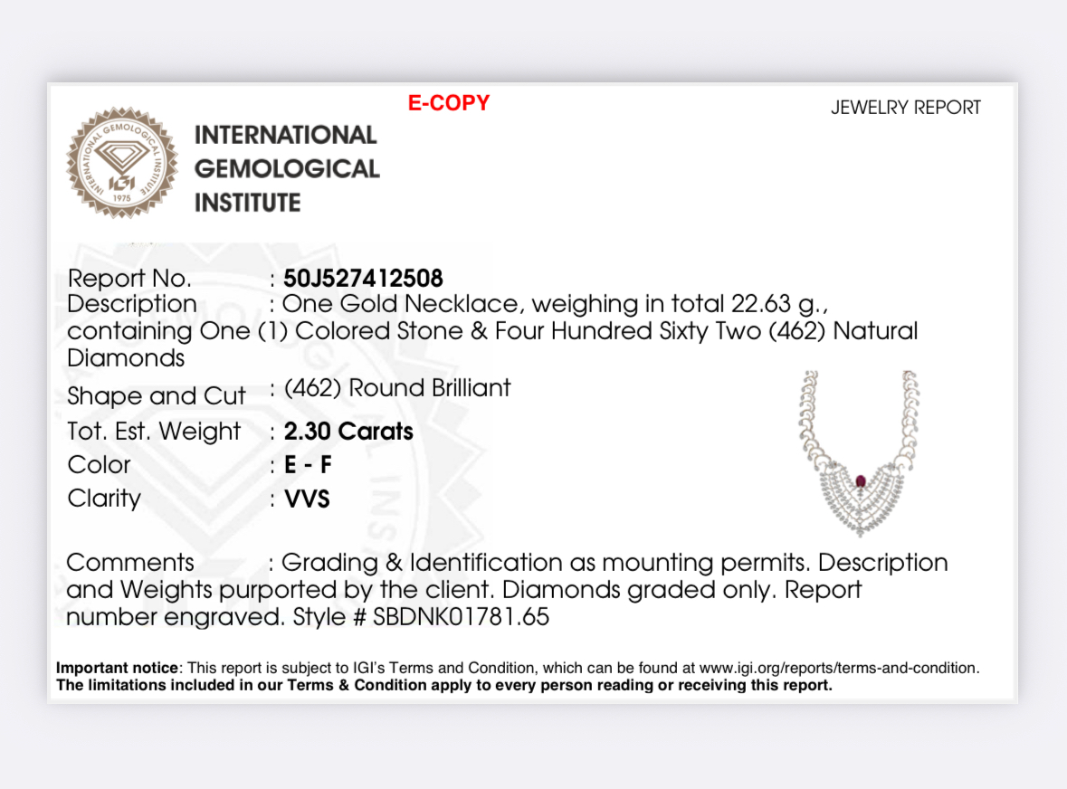 | Radiating with timeless beauty, this 18k rose gold and diamond necklace with rich rubies by Virani captures the essence of modern diamond jewelry. Each diamond is set to reflect light with exquisite brilliance, offering a modern expression of classic luxury. Designed for women who value elegance and craftsmanship, this 18k gold and diamond necklace pairs effortlessly with both evening gowns and contemporary ensembles, making it an heirloom piece that celebrates femininity and refined sophistication. Features • 18k rose gold • Diamond • Ruby Specifications • Minimum Width - 2.5 millimeters • Maximum Width - 54 millimeters • Length - 18 inches • Weight - 22.63 grams Diamond Specifications • Carats - 2.3 • Clarity - VVS • Color - E-F • Cut - Round Brilliant |