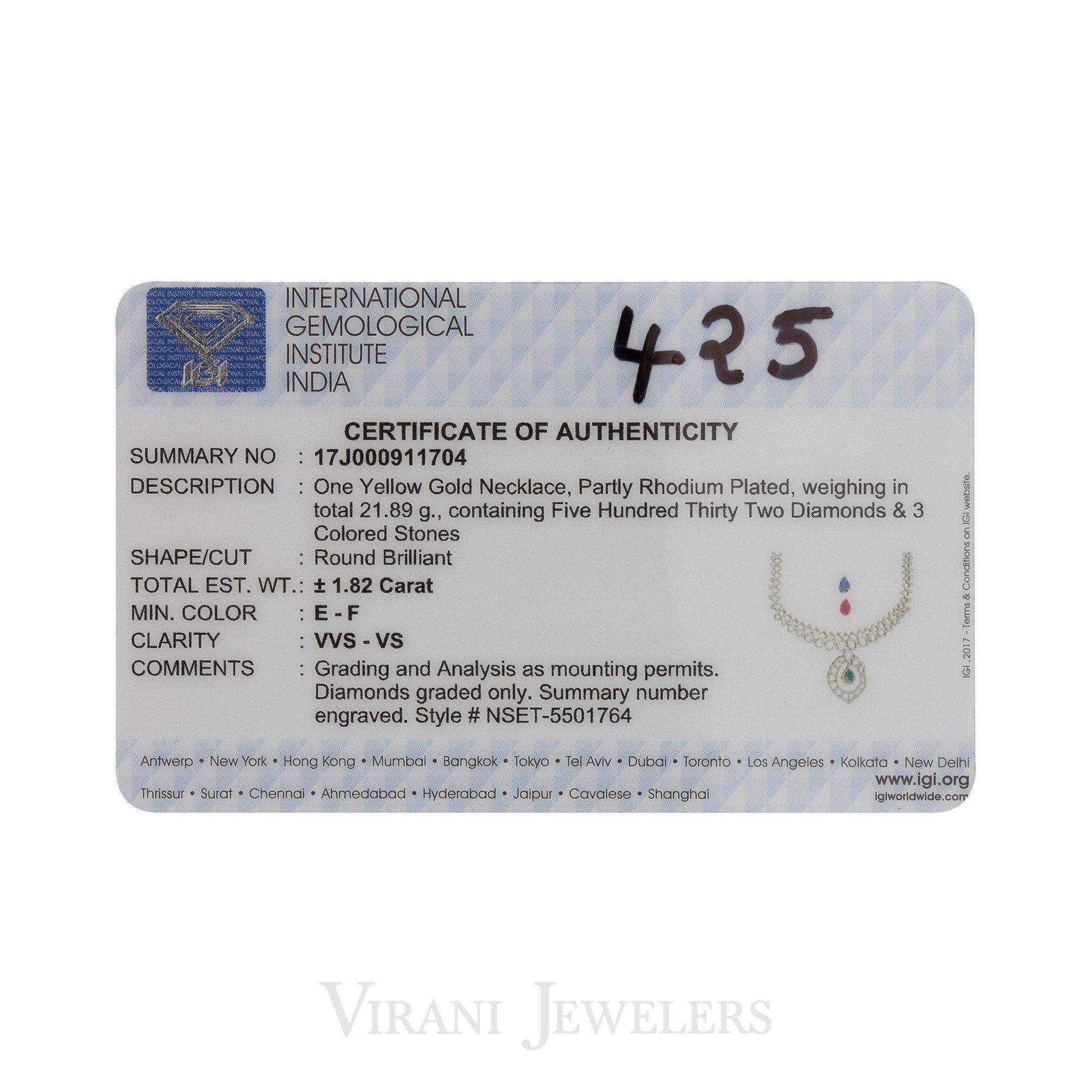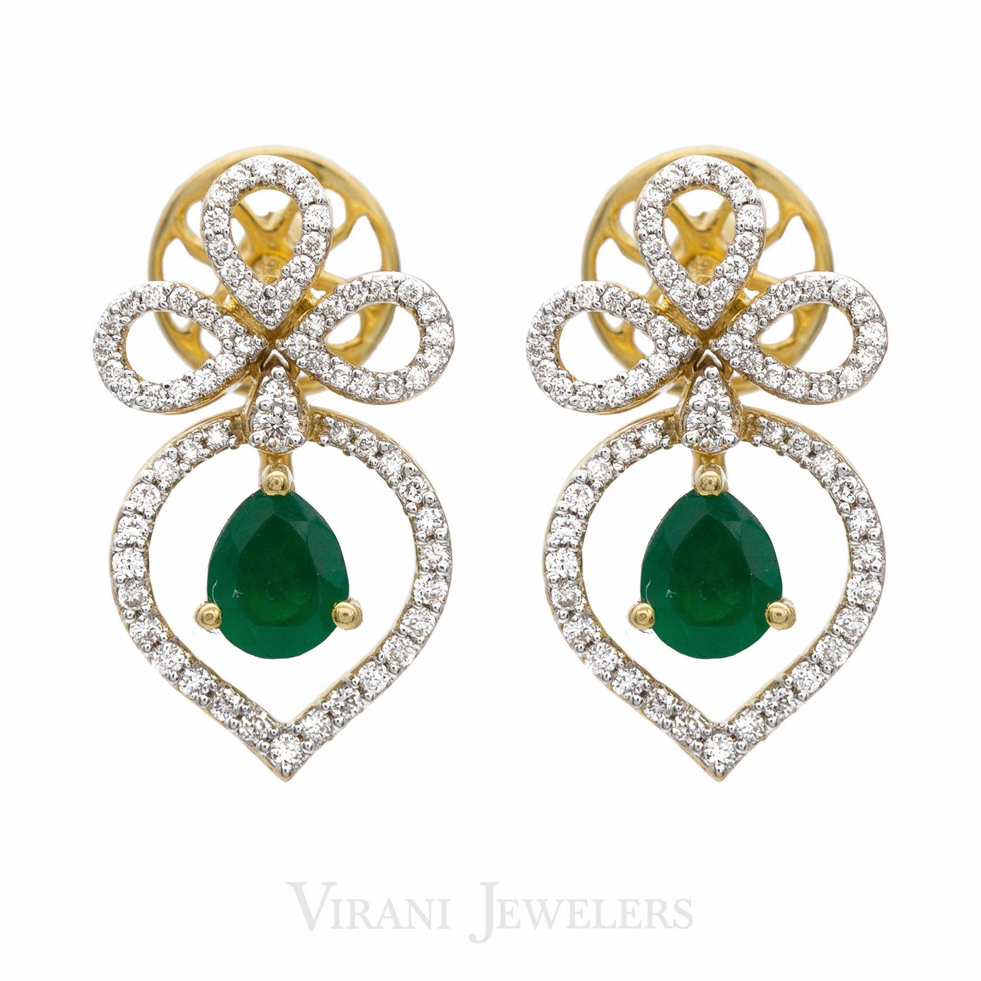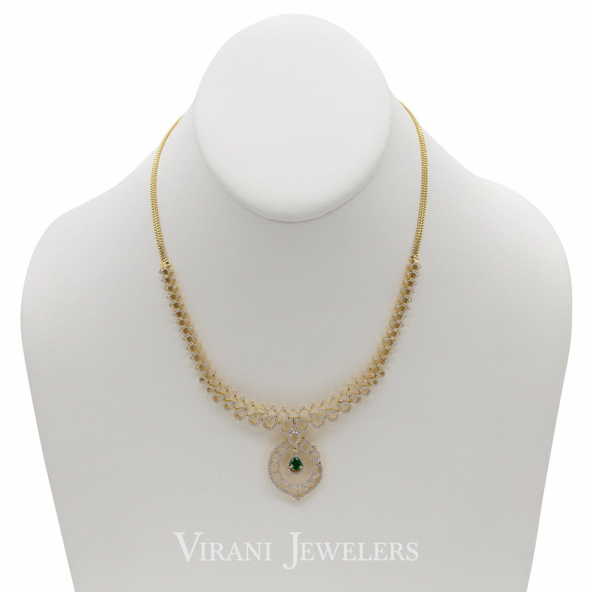 2.15CT Diamond Necklace & Drop Earring Set in 18K Yellow W/Pear Cut Emerald for women. Necklace linked with teardrop frame with each frame set with brilliant diamonds. Beautiful drop pendant highlights a central pear cut emerald. Drop earrings accompanied with chain diamond necklace. Gold weight is 28.05 grams. Perfect as an occasional and bridal jewelry set.