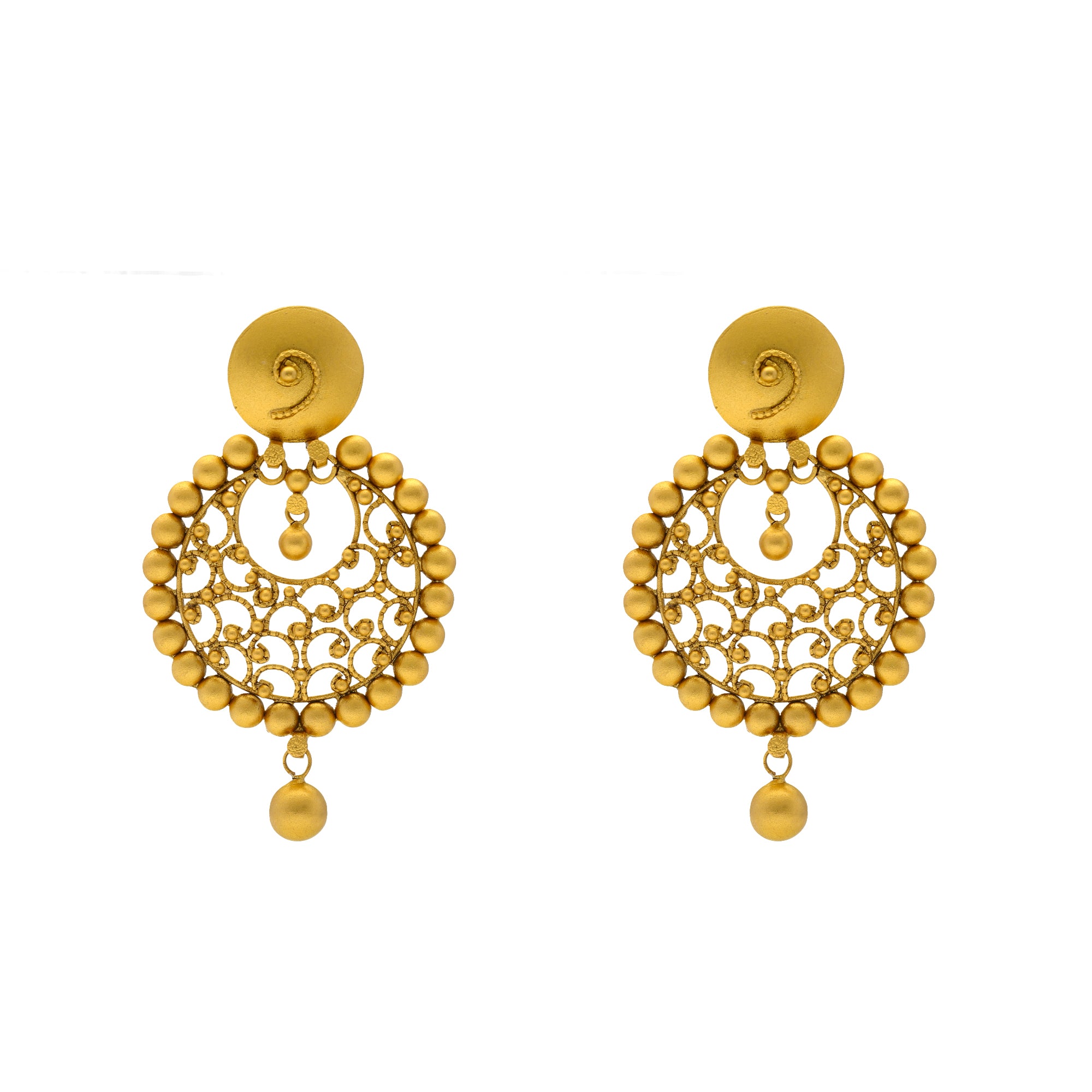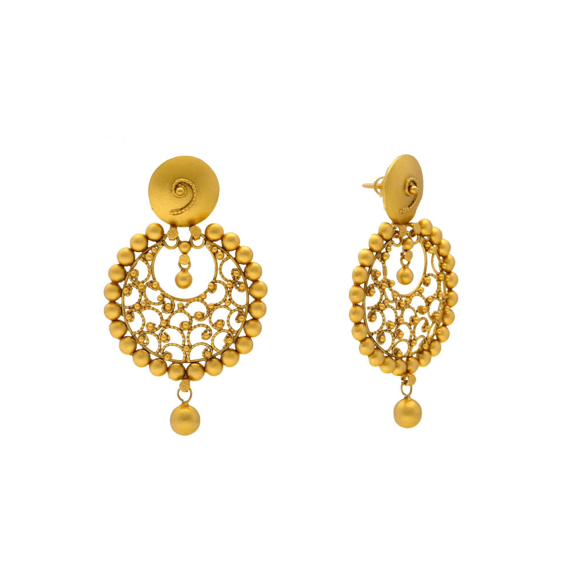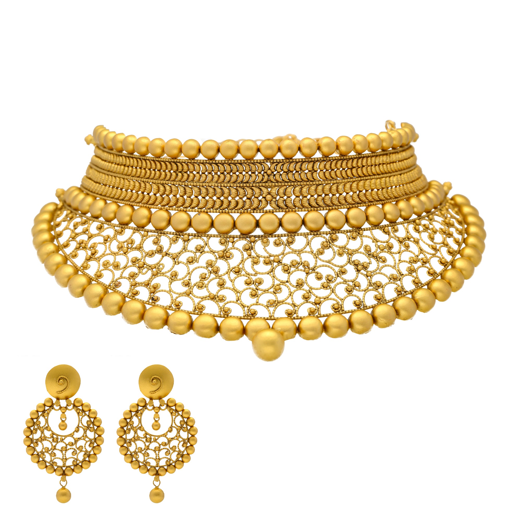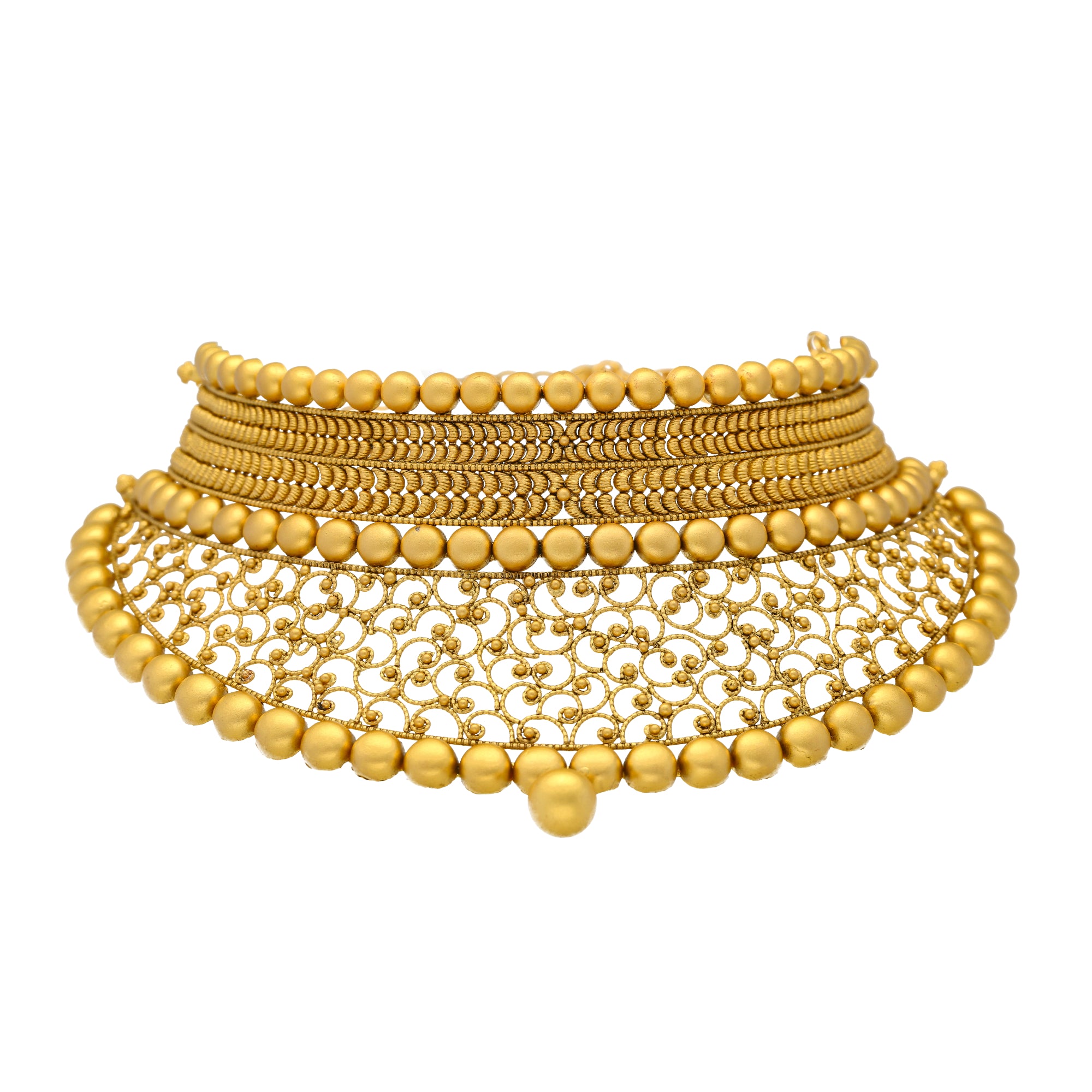 The 22K Antique Gold Chandbali Choker Set will add a vibrant layer of shine to your Indian bridal or traditional attire. The beaded design and style of this 22k Indian gold chanbali earring and necklace set is perfect for special occasions.