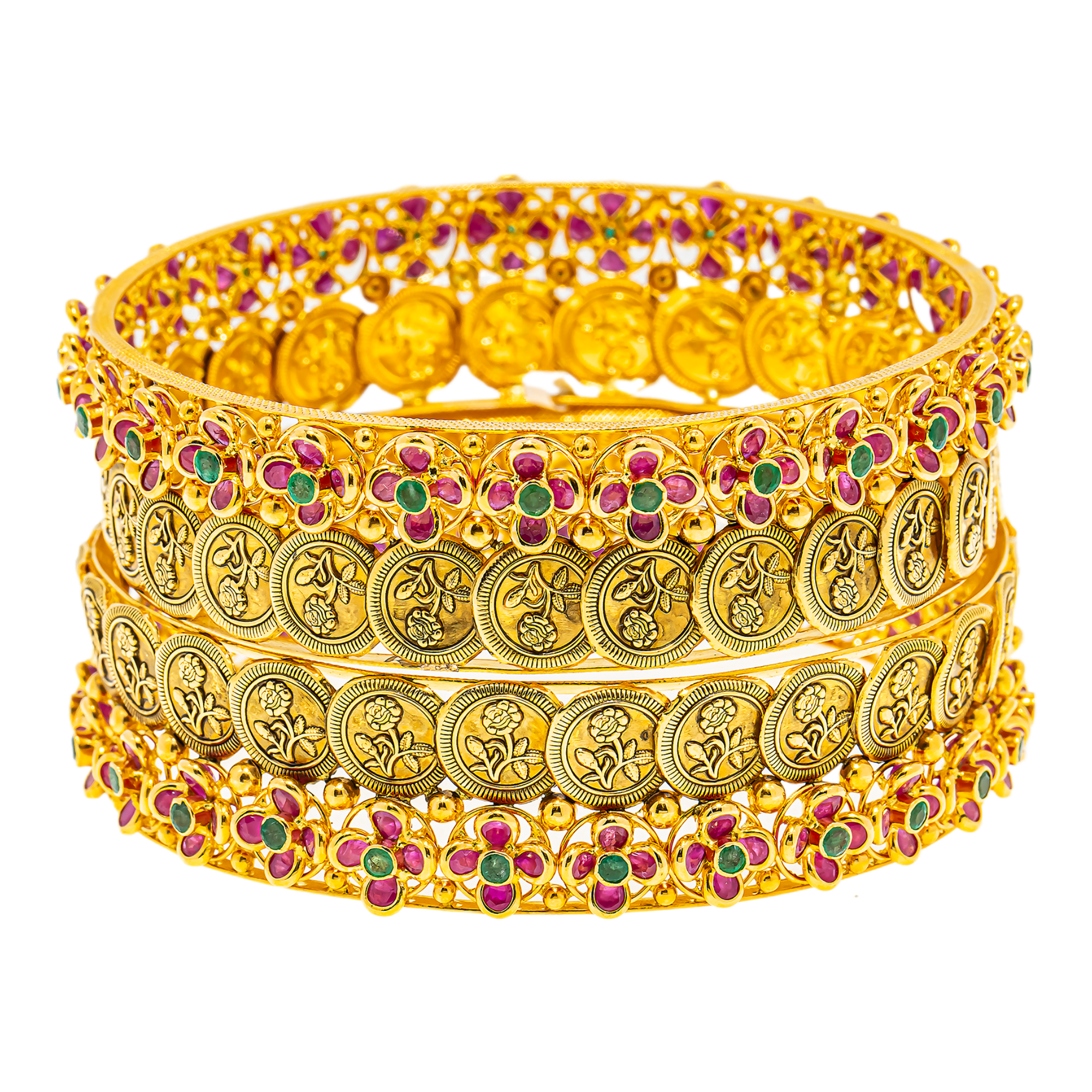 22K Antique Gold & Gemstone Bangle Set of 2 (52.1 grams)