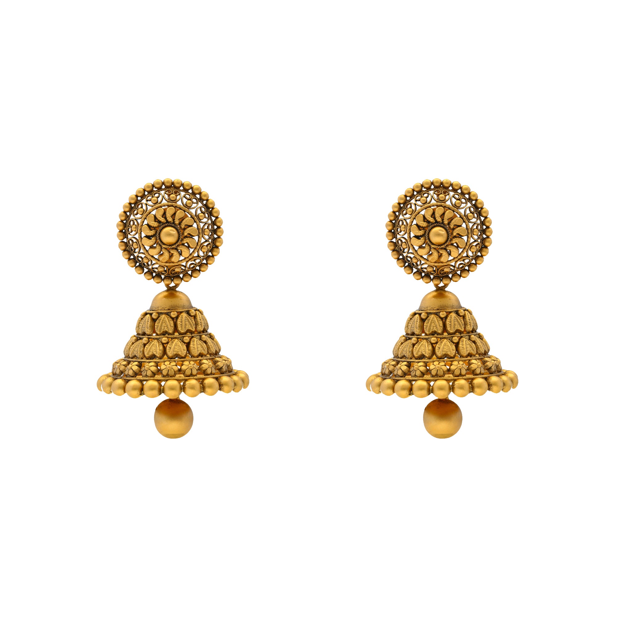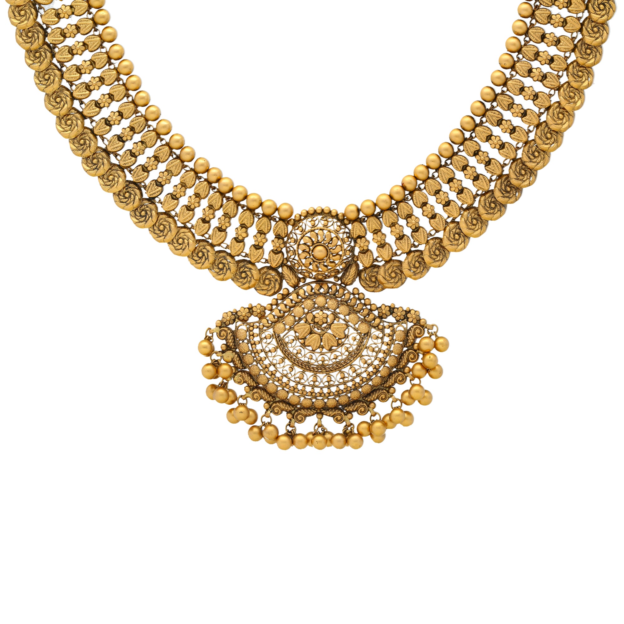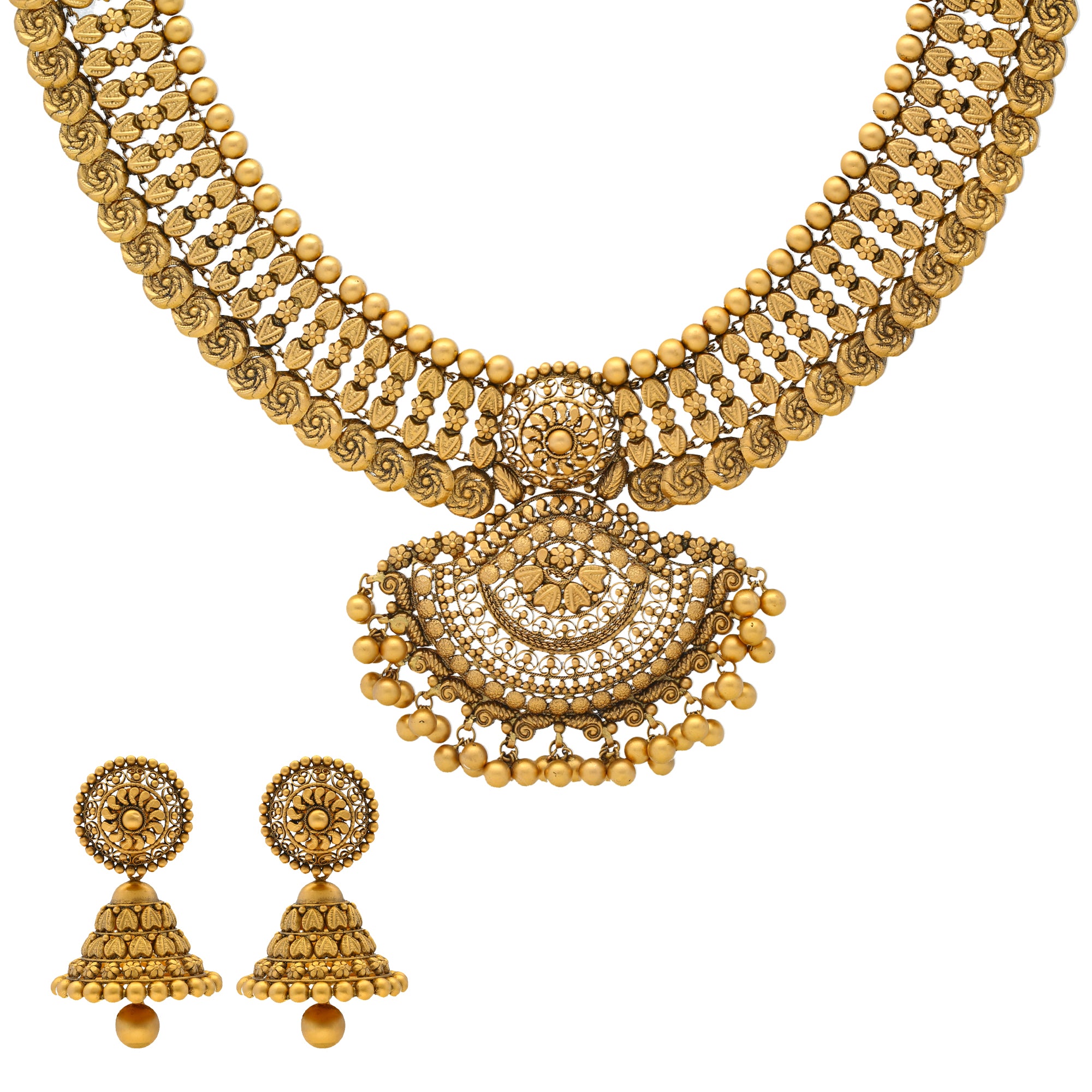 Bring an air of cultural elegance and sophistication to your Indian bridal or tradition gowns with this highly details 22k Indian gold earring and necklace set. The engraved details, antique finish, and beading used to design the jhumka earrings and matching necklace adds a rich look of texture.
