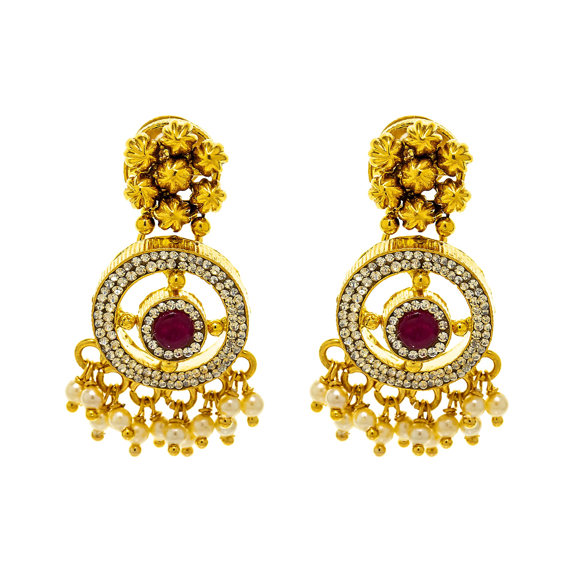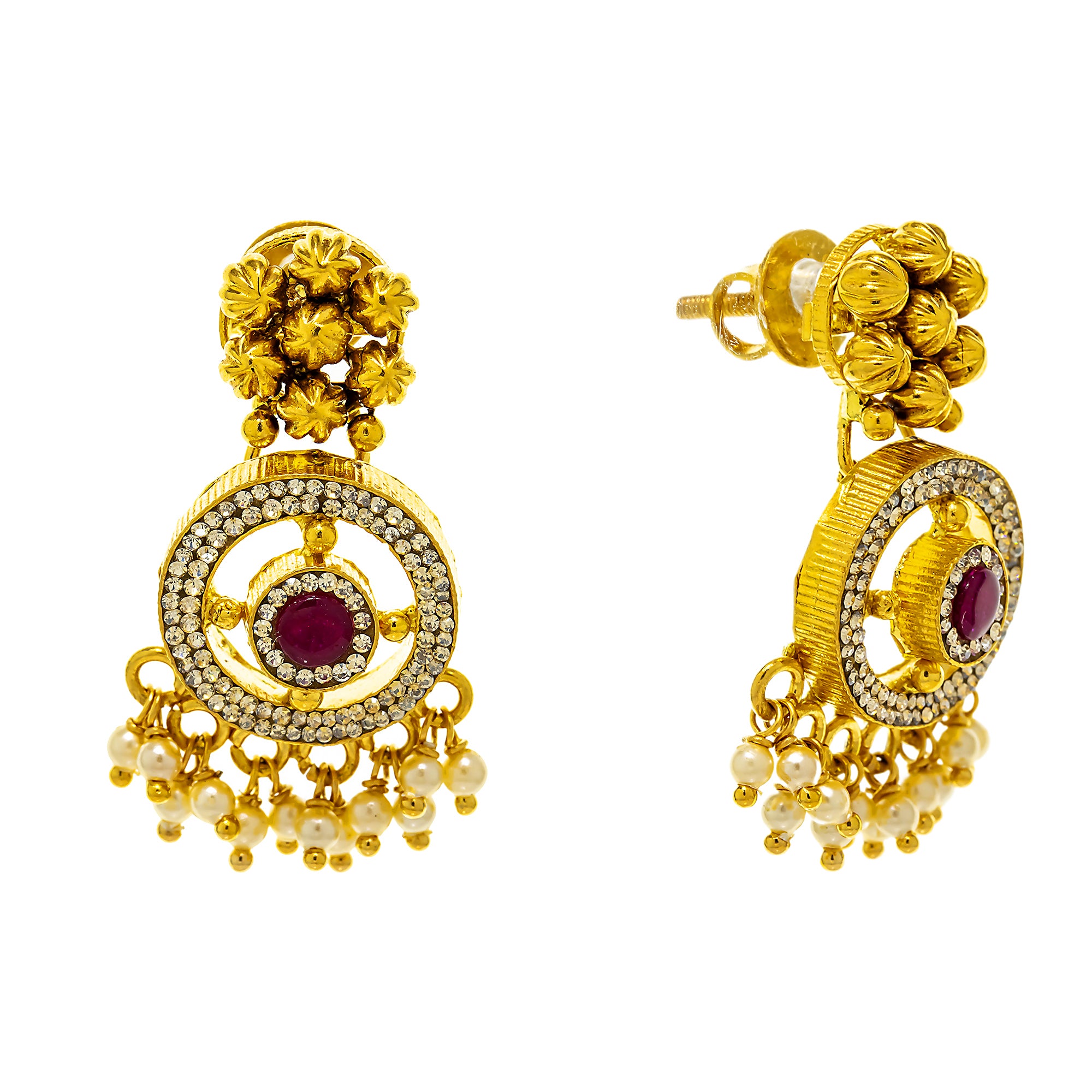 | A striking expression of traditional elegance, this 22K yellow gold necklace and earring set with Kundan and gemstones by Virani Jewelers captures the essence of Indian gold jewelry. The detailed Kundan craftsmanship enhances the brilliance of the gemstones while complementing the warmth of yellow gold. This Kundan jewelry set offers a sophisticated statement ideal for bridal wear, festive events, and cherished family heirloom collections. Features • 22K yellow gold • Antique finish • Cubic zirconia • Emerald • Kundan • Pearl • Ruby Necklace Specifications • Minimum Width - 1.5 millimeters • Maximum Width - 22 millimeters • Length - 16 inches Earring Specifications • Minimum Width - 1 millimeter • Maximum Width - 14 millimeters • Length - 1 inch This necklace and earring set has a combined weight of 39 grams. |
