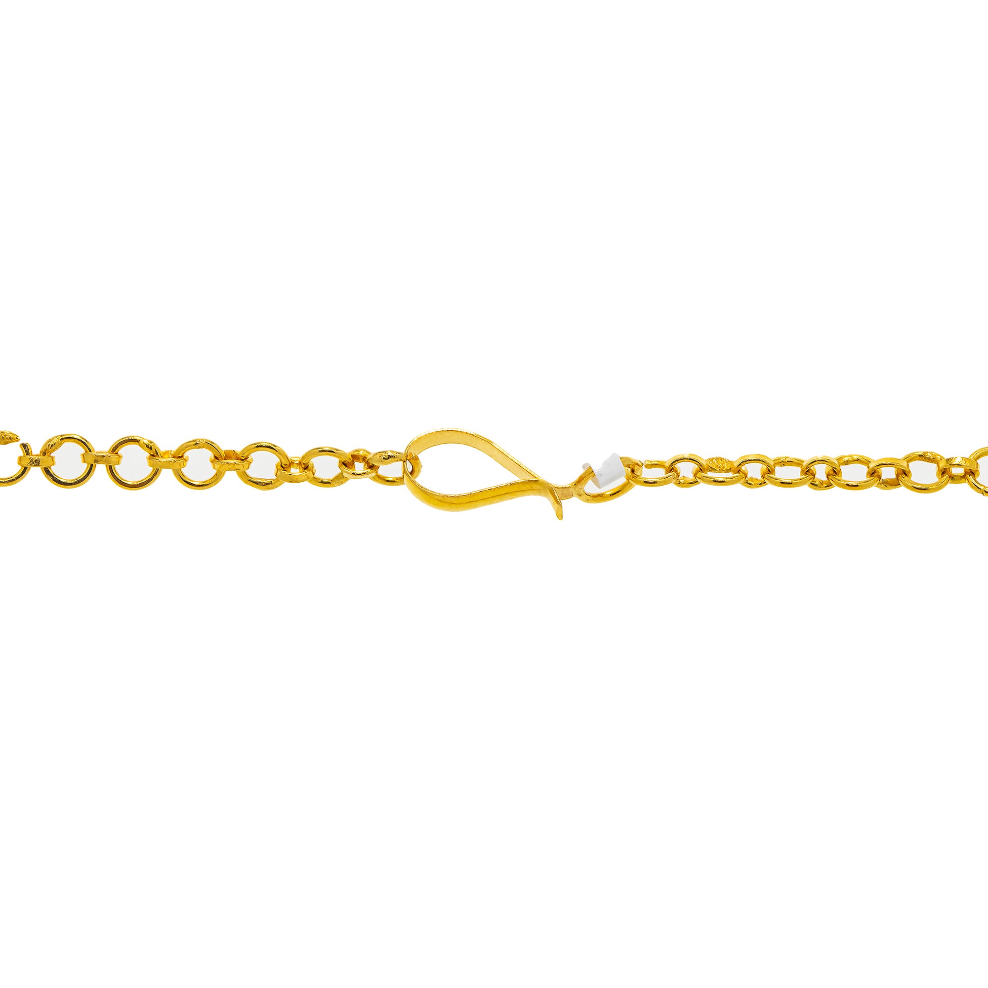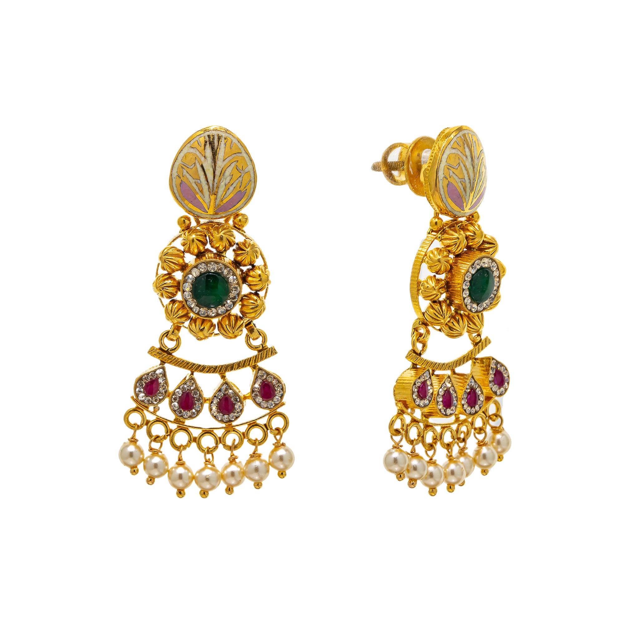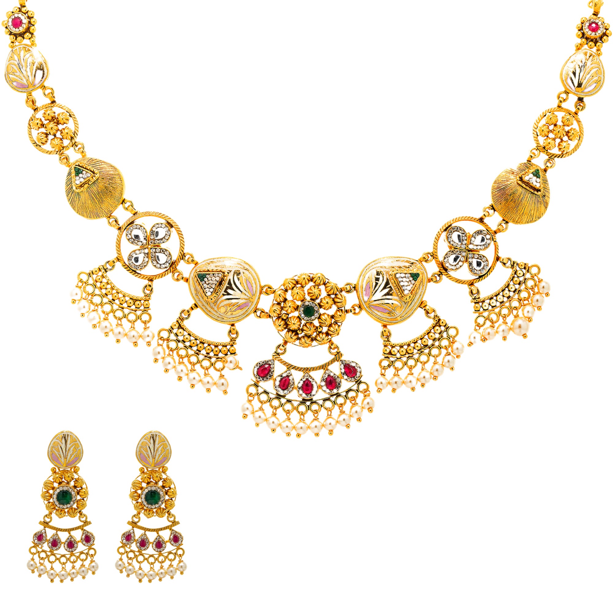 | Crafted in luminous 22k antique gold, this Indian necklace and earring set features intricate Kundan work and carefully placed gemstones. The vintage finish adds depth and character, making it a timeless statement for brides seeking authentic Indian gold jewelry for their wedding ceremonies. Features • 22K yellow gold • Kundan • Emerald • Ruby • Cubic Zirconia • Pearls Necklace Specifications • Minimum Width - 1 millimeter • Maximum Width - 24 millimeters • Length - 16 inches Earring Specifications • Minimum Width - 1.5 millimeters • Maximum Width - 17 millimeters • Length - 1.5 inches This necklace and earring set has a combined weight of 48 grams. |