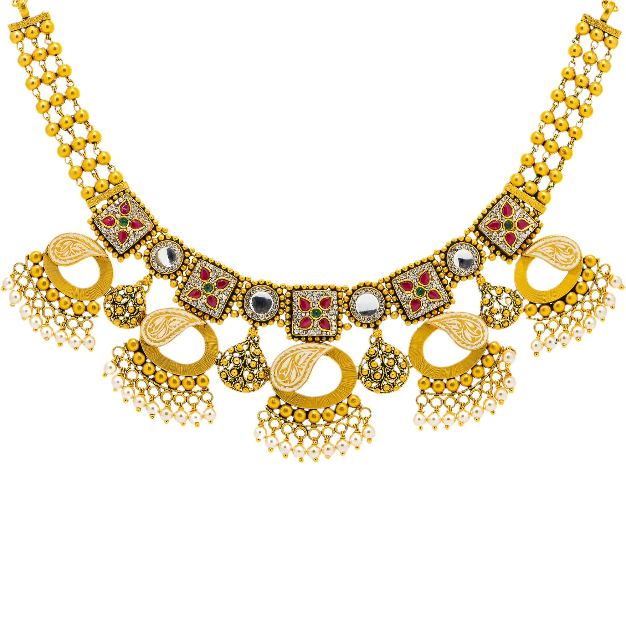 | This 22k antique gold necklace and earring set showcases traditional Kundan artistry accented with vibrant gemstones and pearls. Rich in heritage and handcrafted detail, it’s a striking piece of Indian bridal jewelry designed to elevate wedding and ceremonial looks. Features • 22K yellow gold • Kundan • Emerald • Ruby • Cubic Zirconia • Pearls Necklace Specifications • Minimum Width - 1 millimeters • Maximum Width - 23 millimeters • Length - 16 inches Earring Specifications • Minimum Width - 1.5 millimeters • Maximum Width - 20 millimeters • Length - 1.5 inches This necklace and earring set has a combined weight of 58.8 grams. |