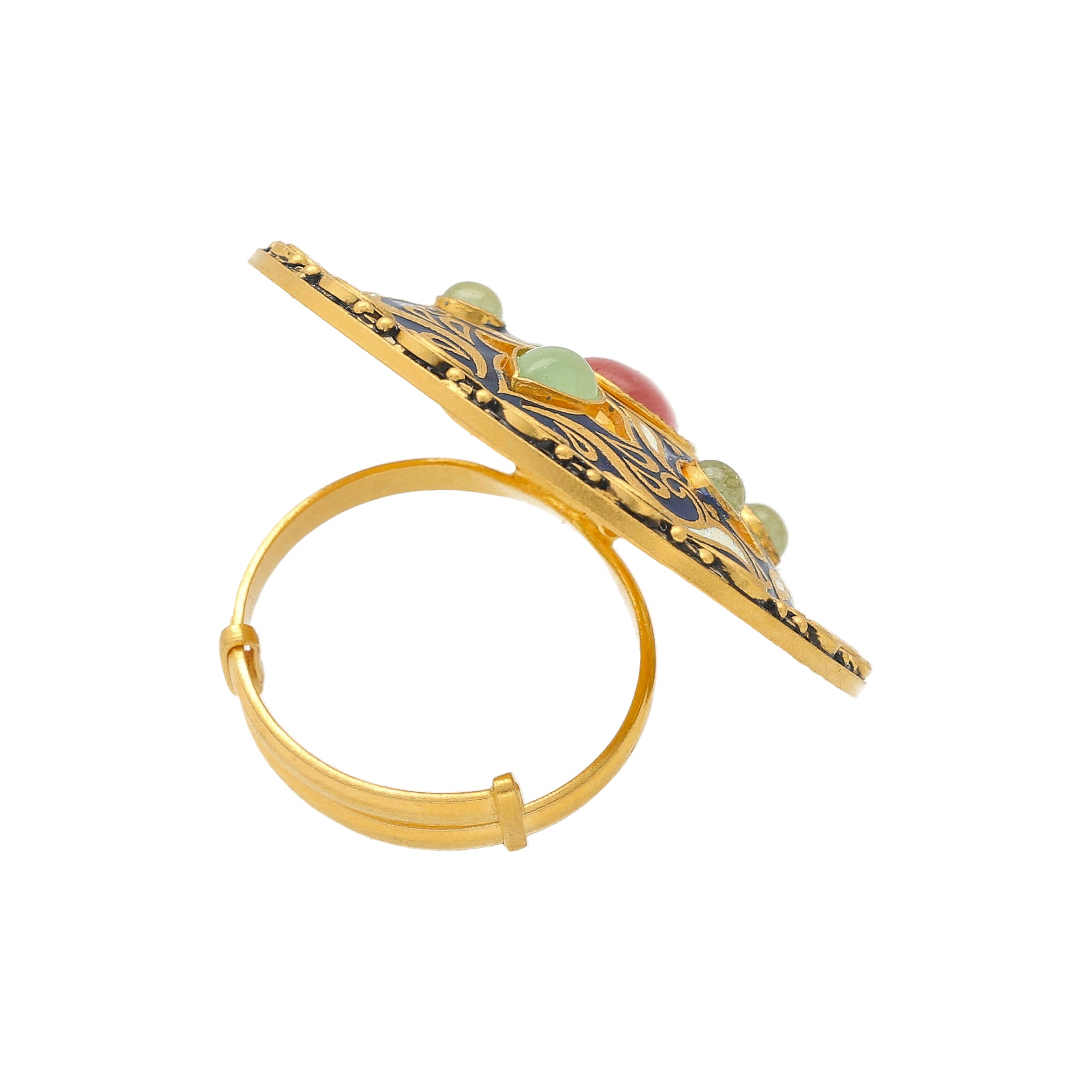 The lovely engraved details adorned with gleaming kundans and rubies give this 22K gold antique-finish cocktail ring with precious stones a sophisticated edge.