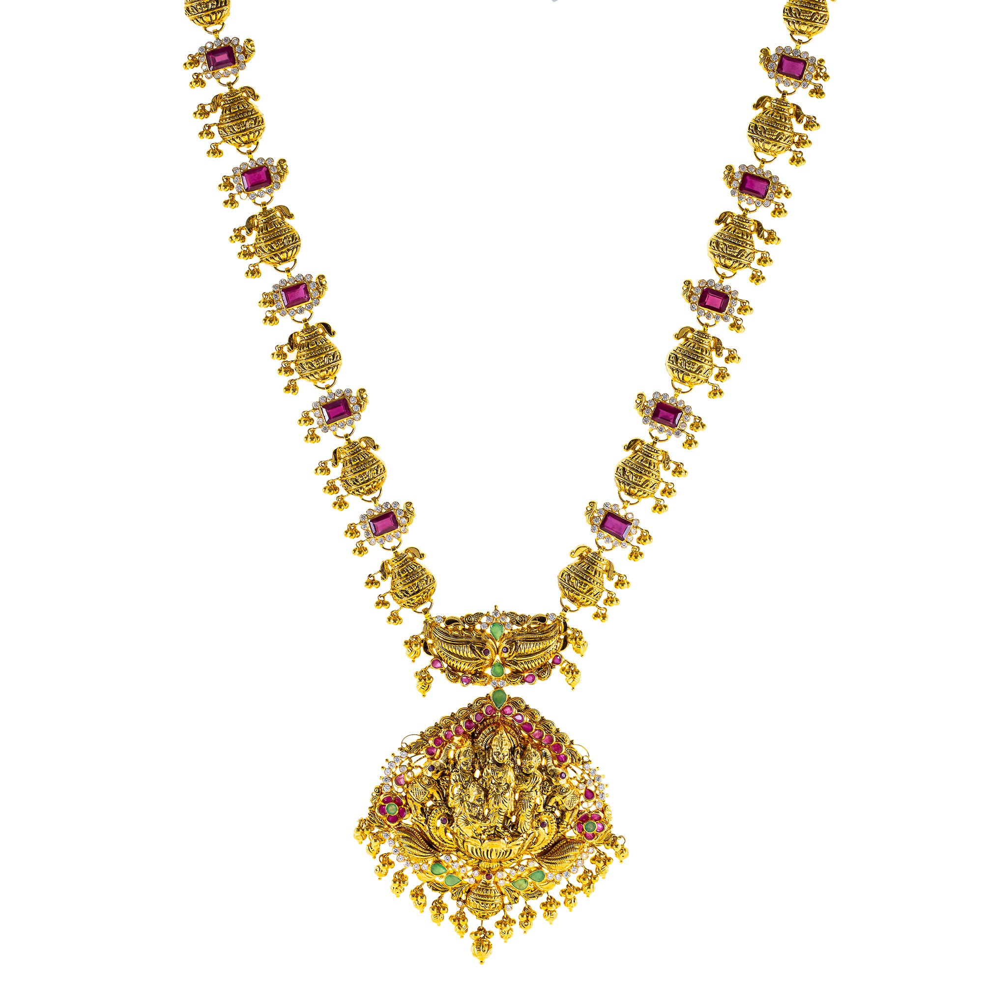 Rubies, emeralds, pearls, and cubic zirconia are carefully arranged in an intricate antique gold design, creating a beautiful balance of color and craftsmanship. The antique finish provides a vintage touch, ideal for those seeking a timeless piece of Indian gold jewelry. Perfect for formal occasions, this 22k gold temple necklace combines luxury with cultural significance, making it an essential accessory for any jewelry lover.