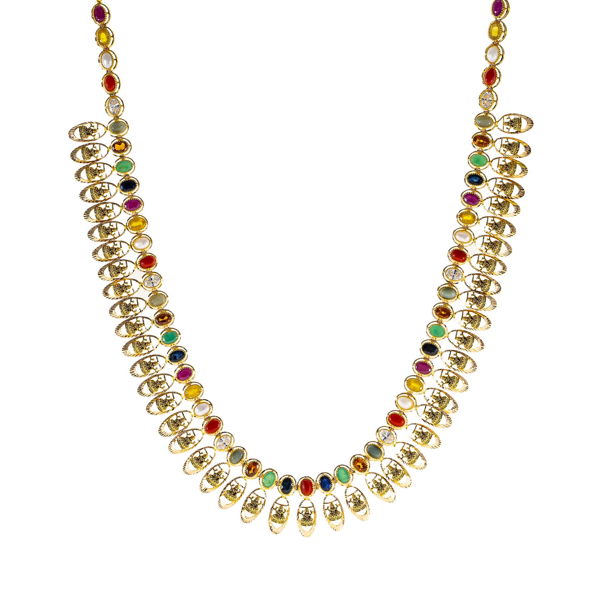 Adorned with rubies, emeralds, Kundan, sapphire, and cubic zirconia, this piece of Indian gold jewelry exudes elegance and sophistication. The antique finish adds a regal touch, while the intricate goldwork showcases masterful craftsmanship. Perfect for formal occasions or festive celebrations, this gold necklace is a stunning representation of timeless beauty and cultural heritage, making it a must-have for discerning jewelry collectors.