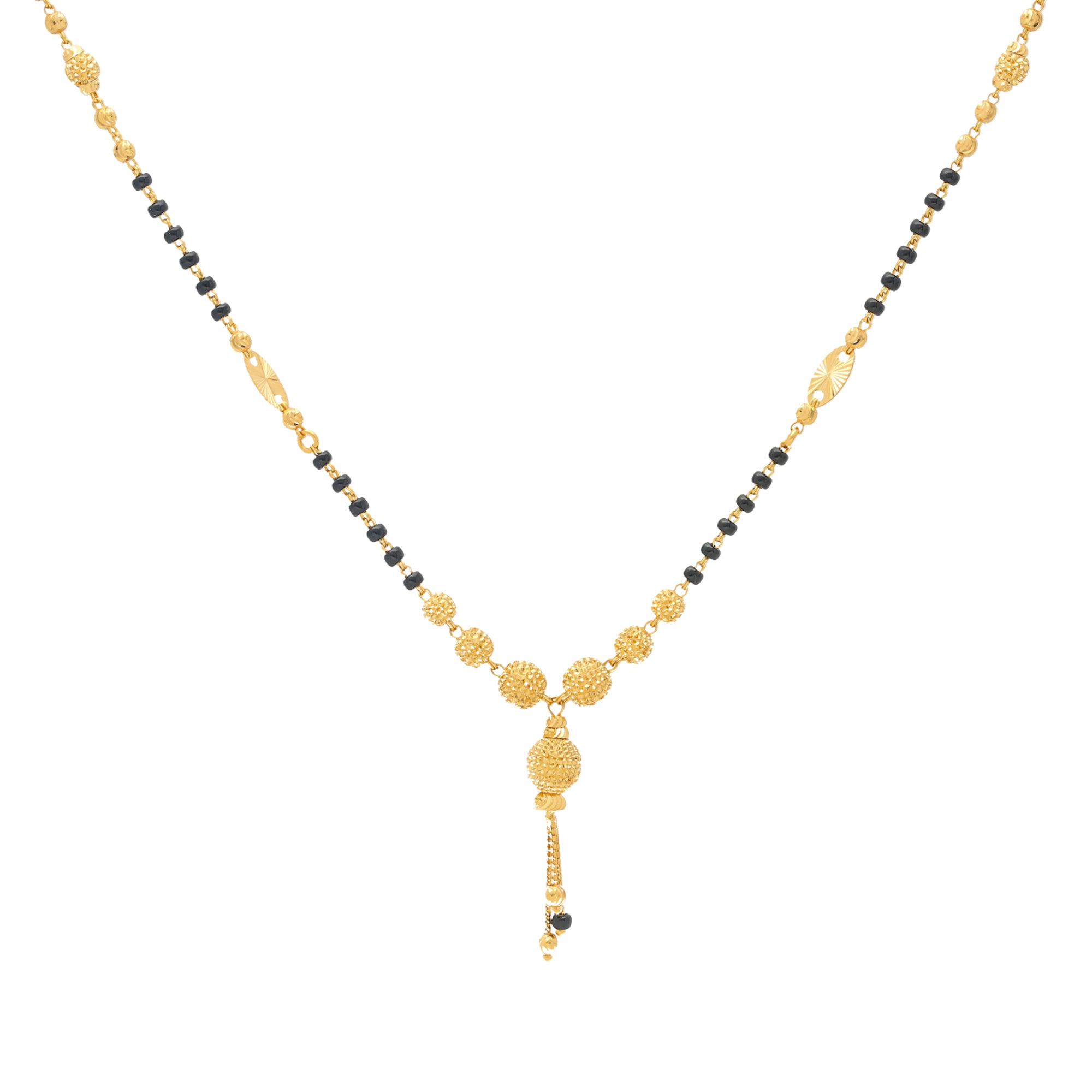 Whether you're getting married or want to dress up your everyday attire with a symbol of your recent nuptials, our 22K gold chain Mangalsutra necklaces are the perfect addition to your wardrobe. The black beads and complementing 22k yellow gold make these pieces elegantly subtle and easy to pair with all your favorite ensembles. Explore our website to discover more stunning 22K gold chain necklaces and more!