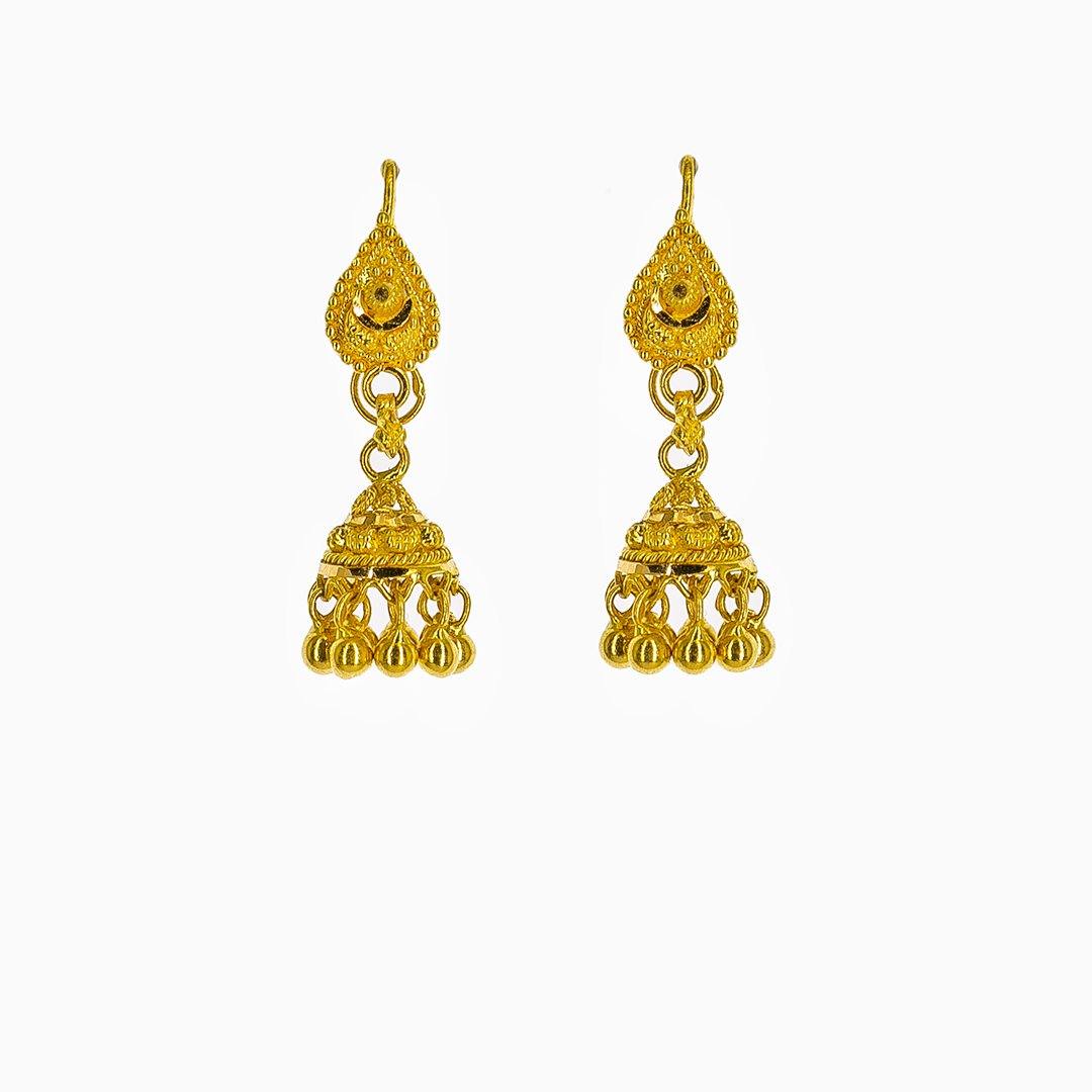 22K Yellow Gold Jhumki Drop Earrings W/ Gold Balls & Teardrop Posts for women. These petite 22K yellow gold Jhumki drop earrings feature dangling gold balls and small teardrop post pendants. Each piece is 23 mm long and 8 mm wide with a total gold weight of 3.1 grams. This lovely pair is suitable for both women and kids.