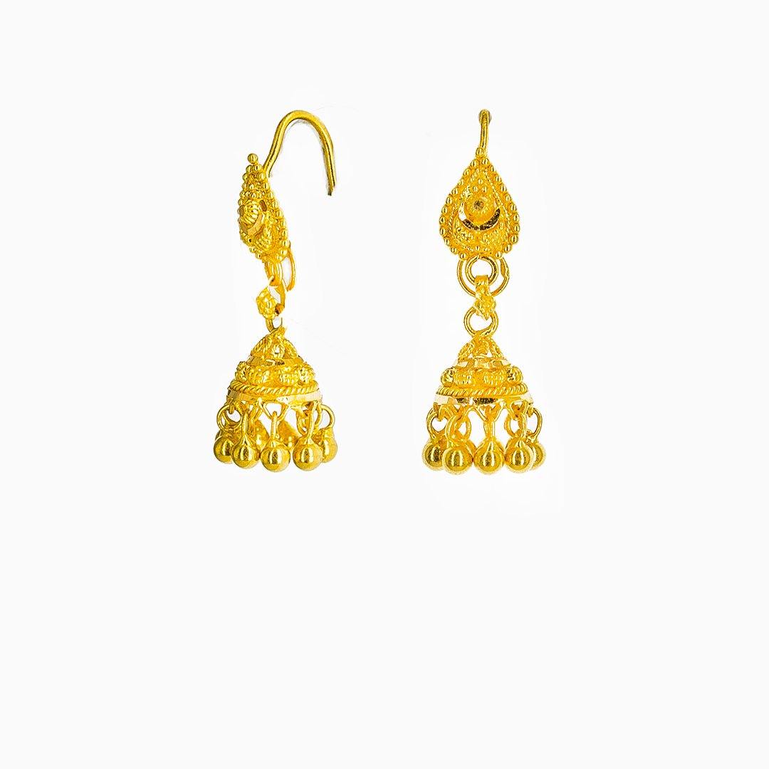 22K Yellow Gold Jhumki Drop Earrings W/ Gold Balls & Teardrop Posts