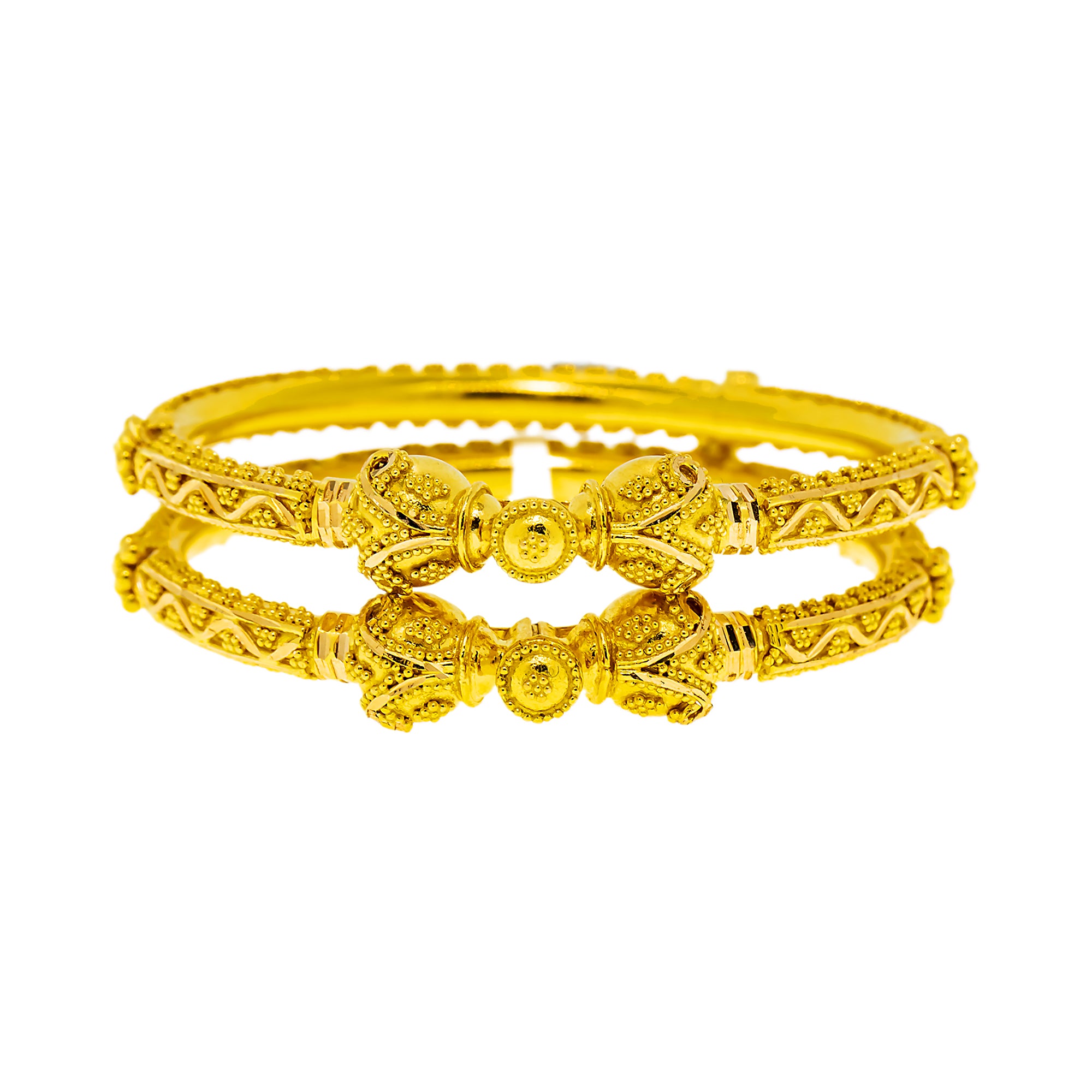 | Radiant and intricately detailed, these 22K gold filigree bangles by Virani Jewelers bring timeless elegance to traditional Indian gold jewelry. The delicate filigree design creates a graceful texture that highlights the luminous beauty of 22K yellow gold. Crafted as classic gold bangles for women, this set offers versatility for celebrations or refined everyday wear. These beautiful pieces of fine gold jewelry designed to be cherished. Features • 22K yellow gold • Filigree details • Set of two (2) bangles Specifications • Minimum Width - 3 millimeters • Maximum Width - 8 millimeters • Diameter - 2 inches • Size - Openable • Weight - 17.6 grams |