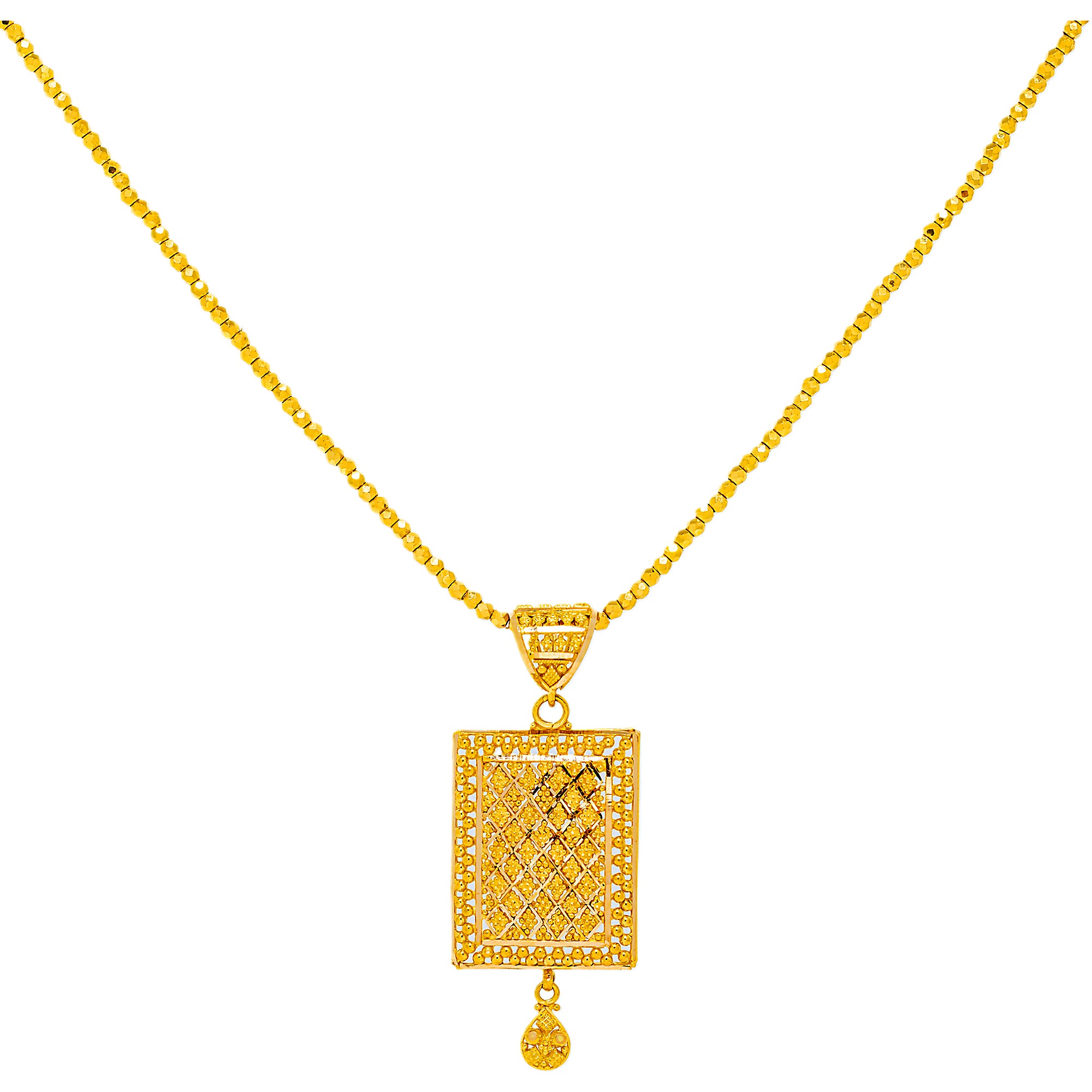 | Refined and radiant, this 22k gold pendant chain and earring set from Virani Jewelers is designed for effortless sophistication. Created for women, it showcases the richness of Indian gold jewelry with a sleek, elegant finish. Ideal for weddings, celebrations, or elevated everyday wear, this gold pendant set offers timeless beauty and exceptional craftsmanship. Features • 22K yellow gold • Filigree details Chain Specifications • Minimum Width - 13 millimeters • Maximum Width - 24 millimeters • Length - 4.4 inches Earring Specifications • Minimum Width - 5 millimeters • Maximum Width - 10 millimeters • Length - 1.9 inches • Combined weight - 9.9 grams |