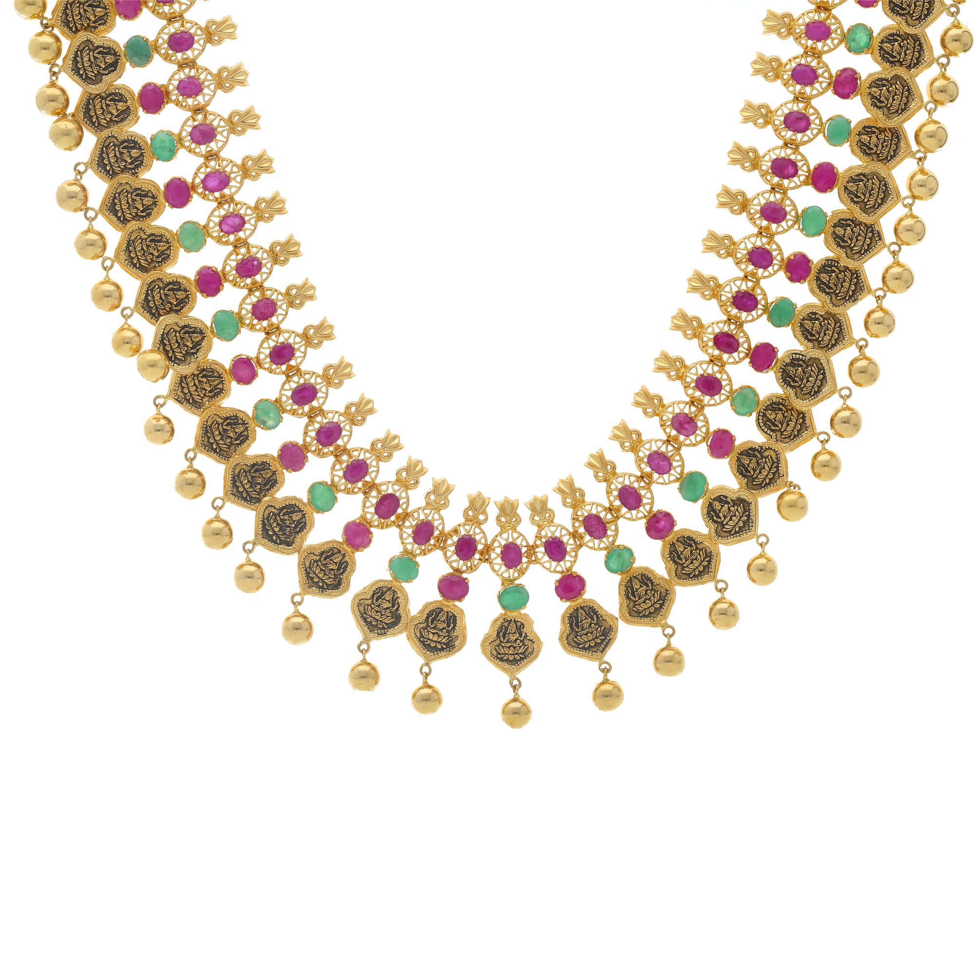 Our 22K Yellow Gold & Gemstone Kasu Temple Necklace has a vibrant assembly of emeralds and rubies adorning the engraved design of Goddess Lakshmi.