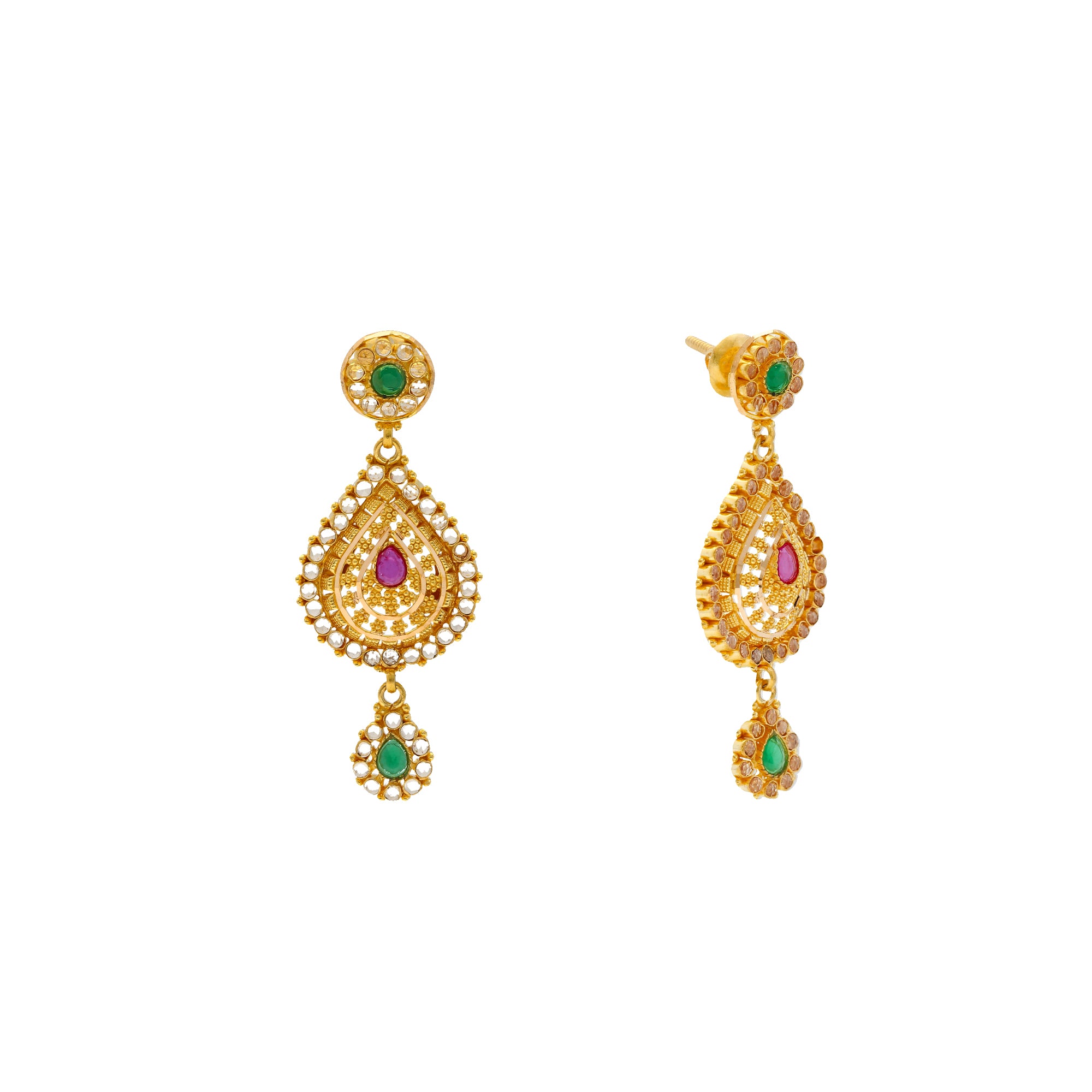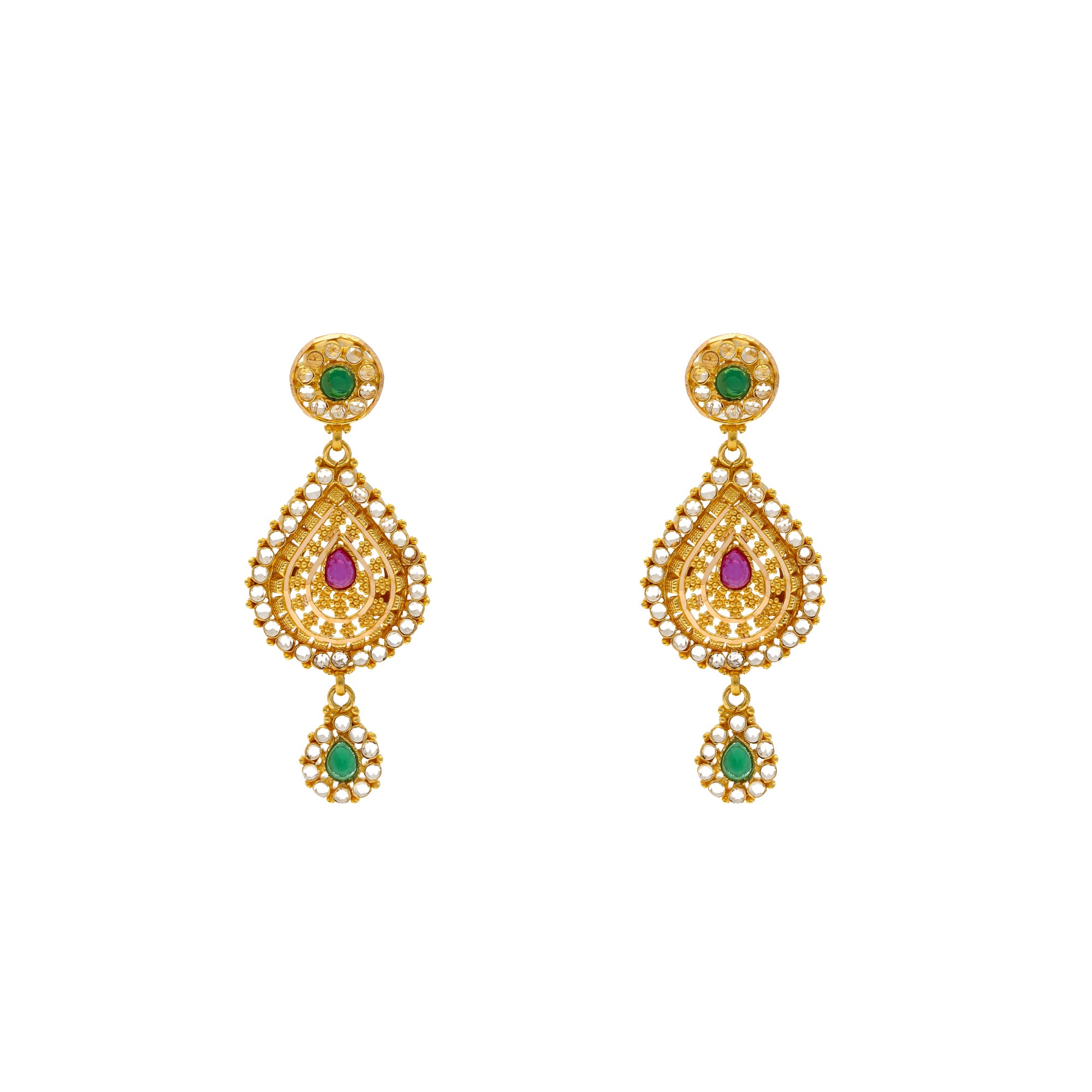 Our 22K Gold & Gemstone Priya Choker Set one of the most exquisite sets we carry here at Virani Jewelers. The dazzling display of expert filigree work, emeralds, rubies, and 22k yellow Indian gold adorning the choker necklace and earrings will add an air of cultural elegance to any Indian bridal or traditional gown.