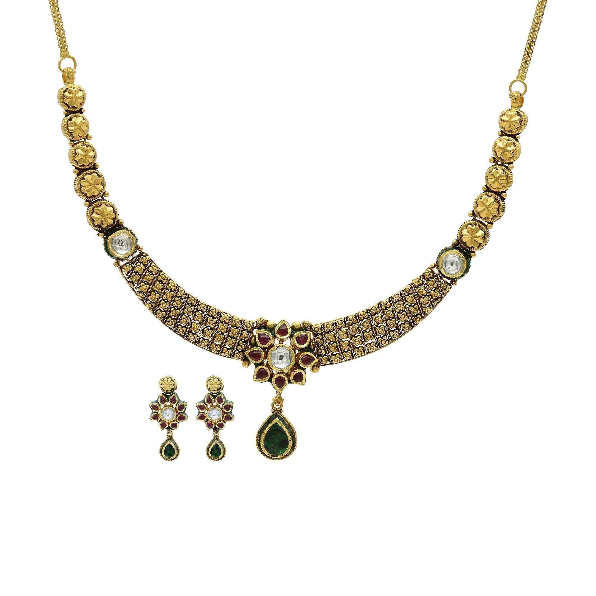 22K Gold Ruby Emerald Kundan Floral Necklace & Earrings Set for women. Necklace and earring set features a gold antique finish with floral frame accents. Set includes ruby, emerald, and kundan stones. Total set weight is 48.2 grams and necklace length is 13". Perfect occasional jewelry set.