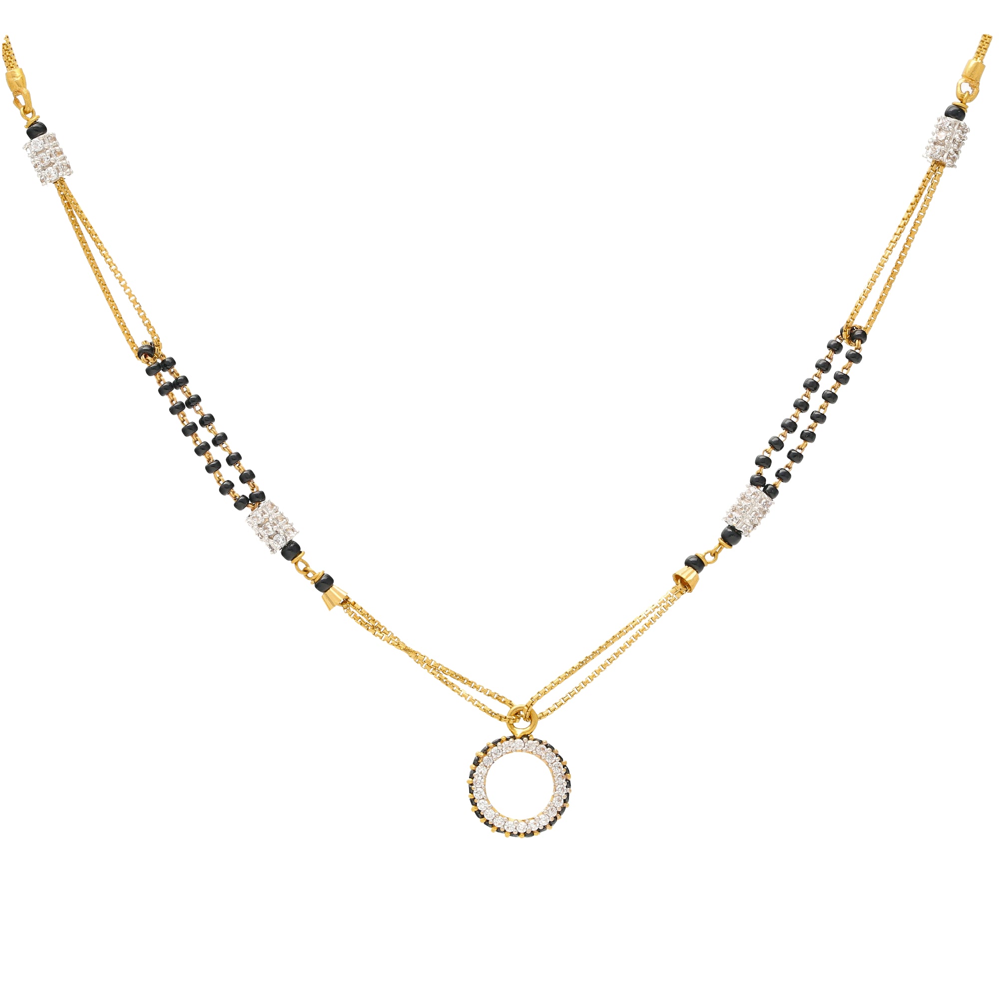This luxurious piece of Indian gold jewelry is elegant, sophisticated, and timeless. The traditional black beads and stunning assortment of cubic zirconia used to create this modern 22k gold Mangalsutra necklace add a vibrant contrast to the minimal design. The circular pendant brings out the stylish appeal and sophisticated allure of this exquisite piece of Indian gold jewelry.