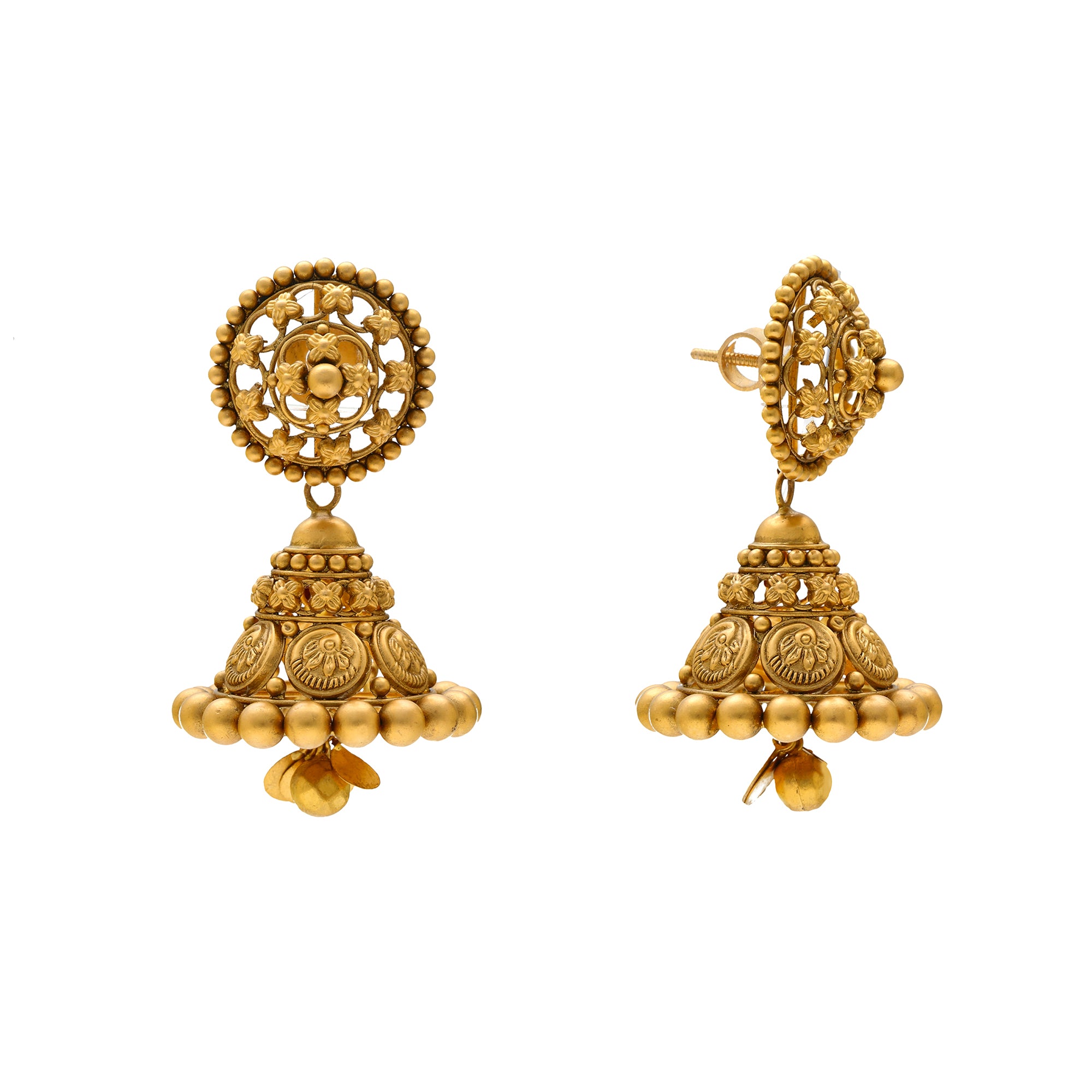 This charming 22k gold jhumka earring and necklace set features exquisite beading and subtly engraved details. Wearing this beautiful antique gold Indian jewelry set will add a sense of cultural sophistication and pride to the occasion. This gold necklace and jhumka earring set have a combined weight of 98.6 grams, making its beauty and expert craftsmanship hard to ignore.