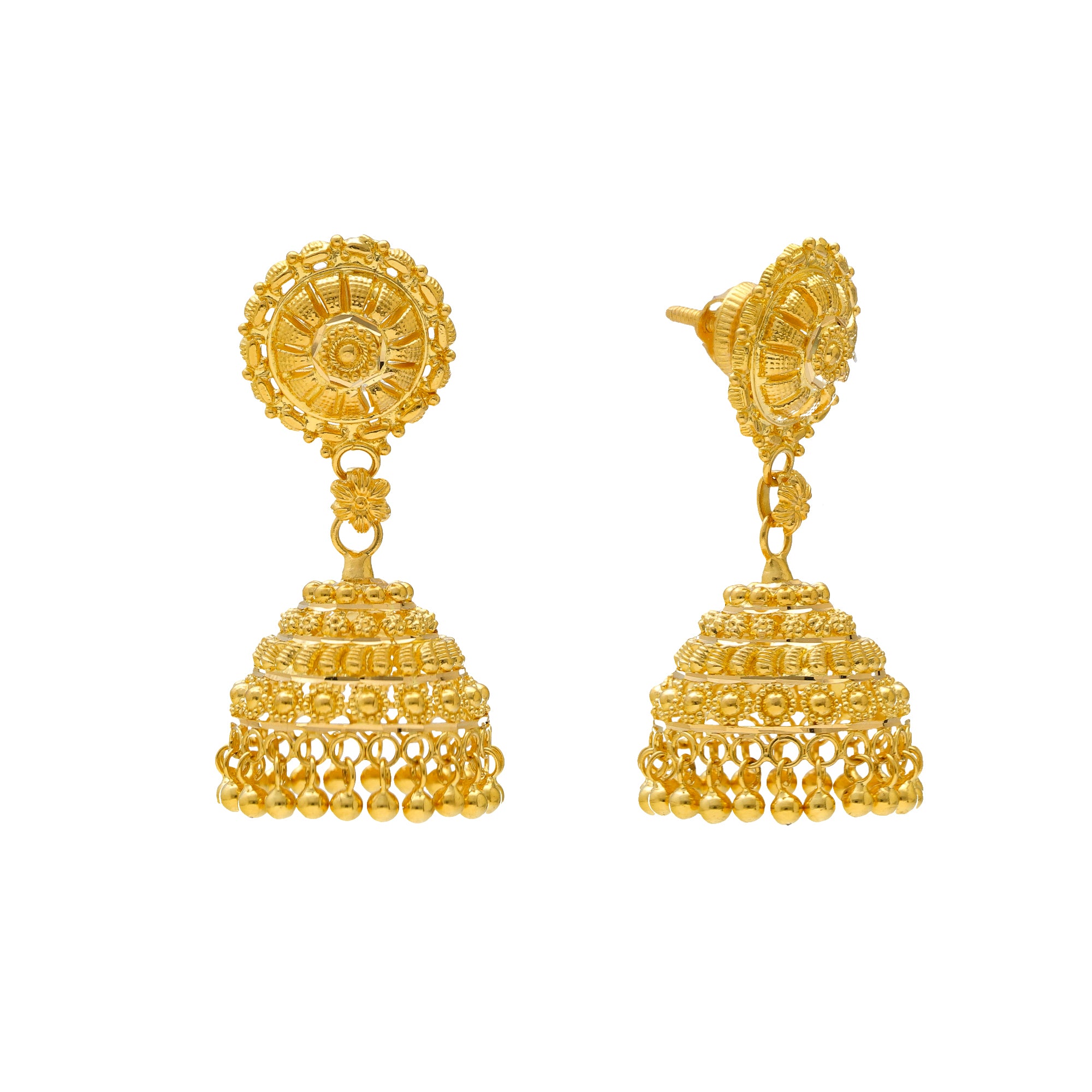 This 22k yellow gold Indian jewelry set features beautiful filigree work and lush beading. The matching gold jhumka earrings help bring the look together. This 22k gold necklace and earring set weighs a total of 45.8 grams, making it a substantial piece of Indian gold jewelry.