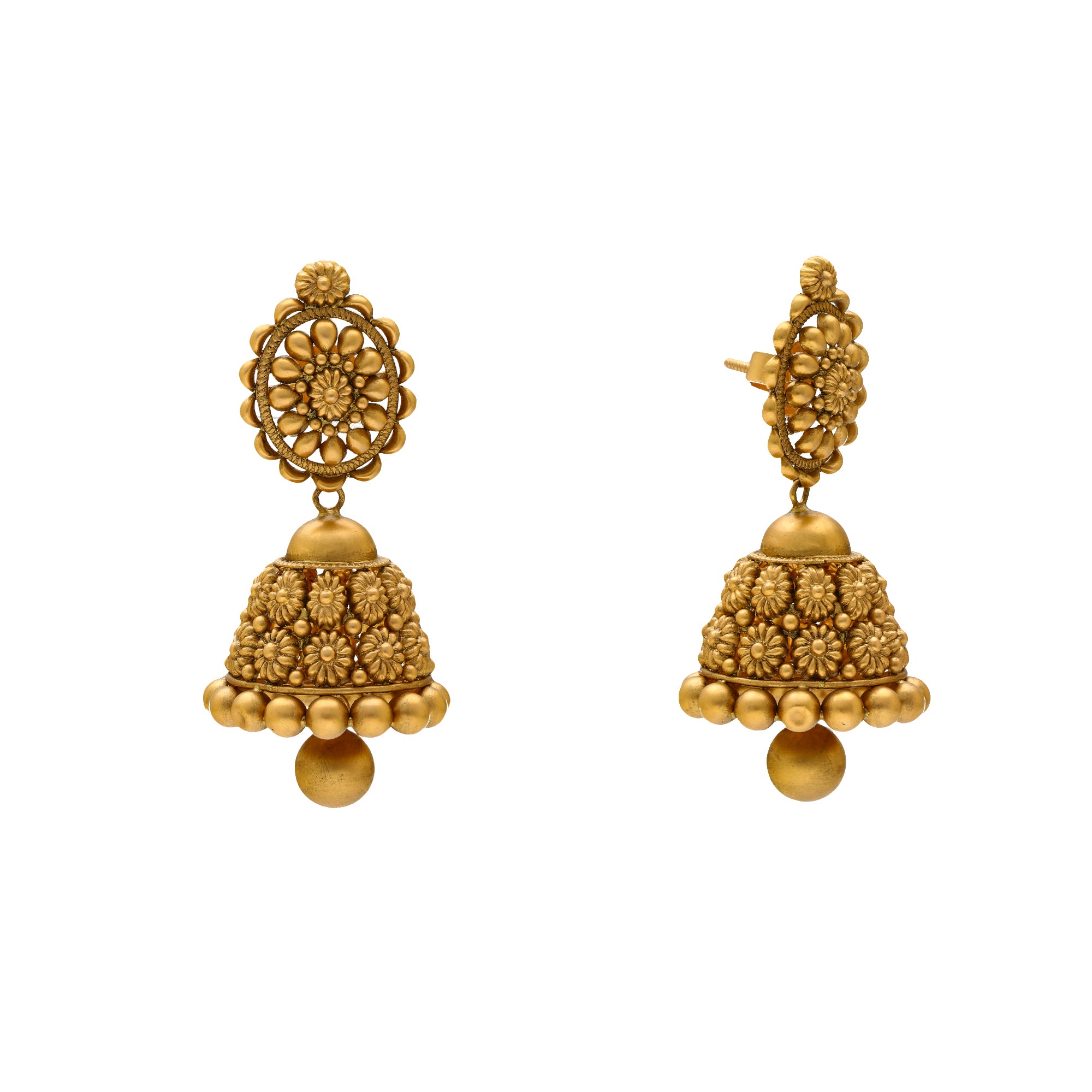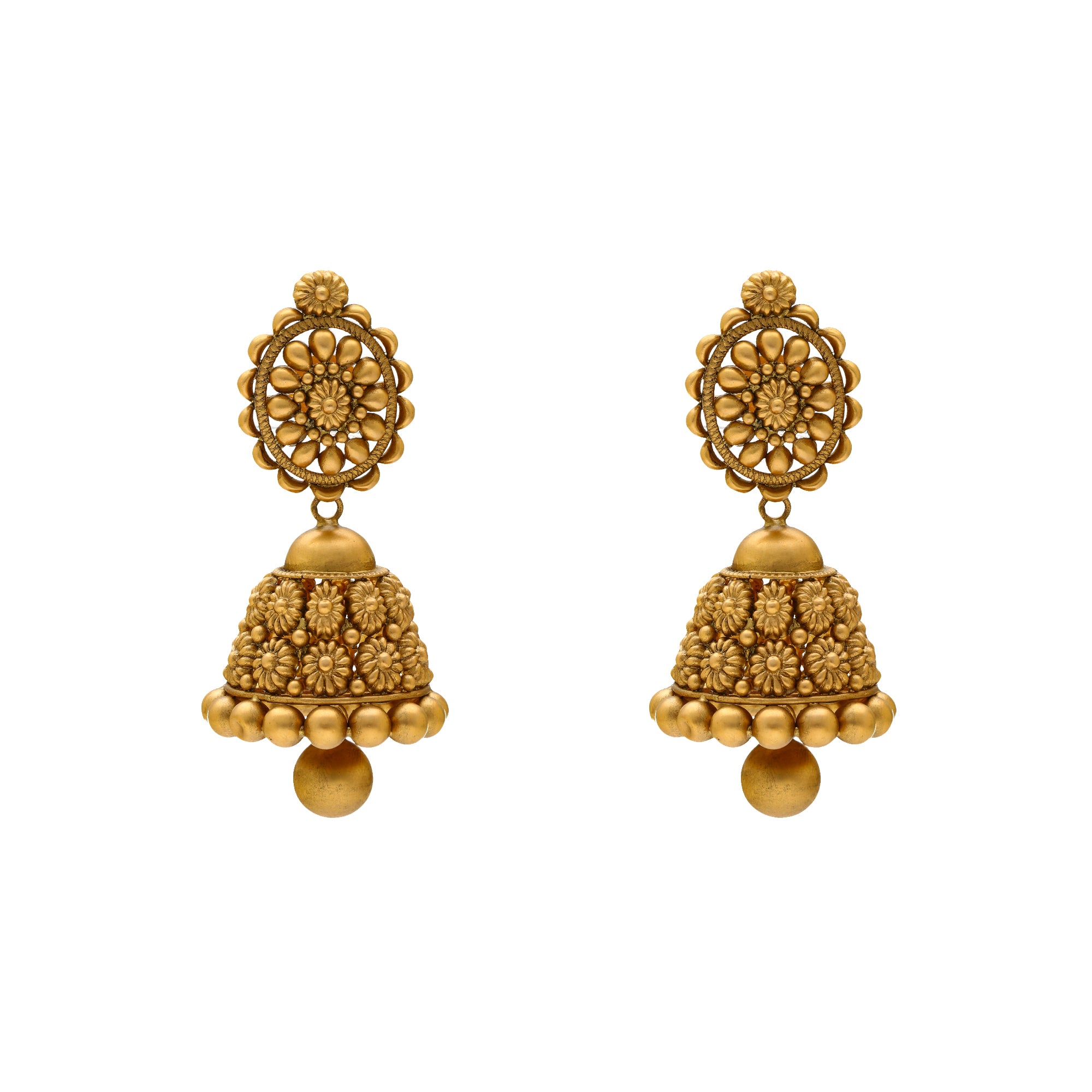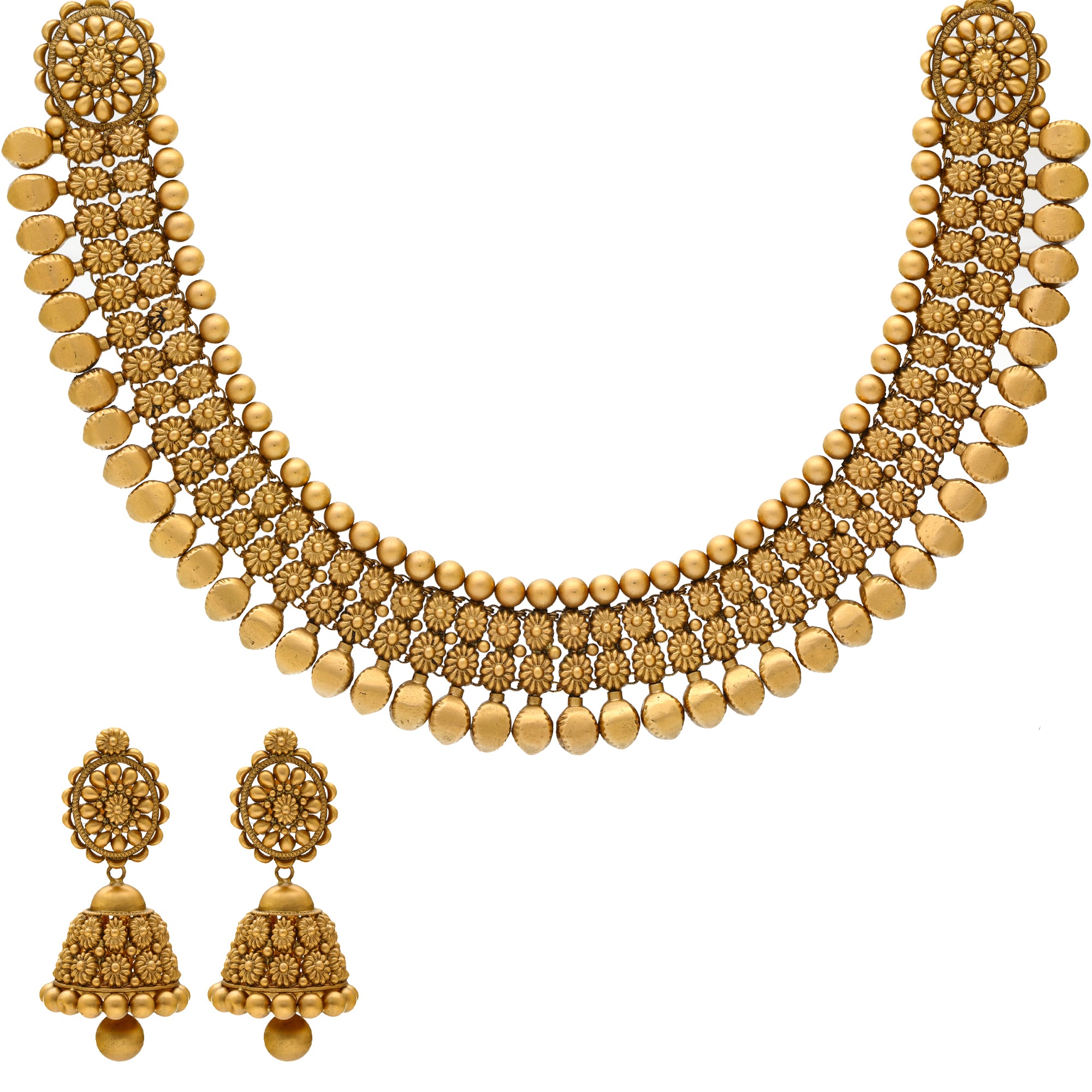 The beauty of this 22k gold Indian jewelry set lies within the rich assortment of cultural details. The beaded design is adorned with elegant engravings that bring a sense of tradition and glamour. This gold necklace with matching jhumka earrings can be worn with traditional Indian dress as well as bridal gowns to create a stunning look for a special occasion.