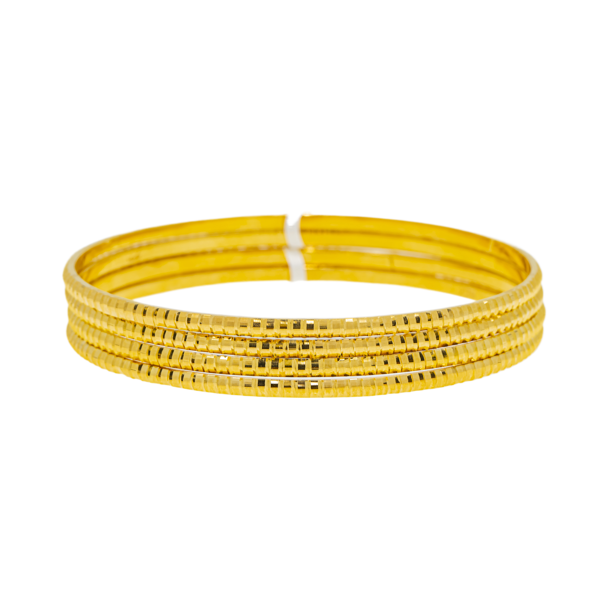 | These exquisite 22k yellow gold bangles by Virani Jewelers are a timeless symbol of elegance and tradition. Crafted in pure gold, they feature a smooth, radiant finish that reflects light beautifully with every movement. Designed as classic gold bangles for women, they offer effortless versatility for daily wear or special occasions. Inspired by heritage, these thin gold bangles honor the enduring beauty of Indian jewelry, making them a meaningful addition to any fine gold collection. Features • 22K yellow gold • Engraved details • Set of twelve (12) bangles Specifications • Minimum Width - 1.5 millimeters • Maximum Width - 2.5 millimeters • Diameter - 2.25 inches • Size - 2.4 • Weight - 127.9 inches |