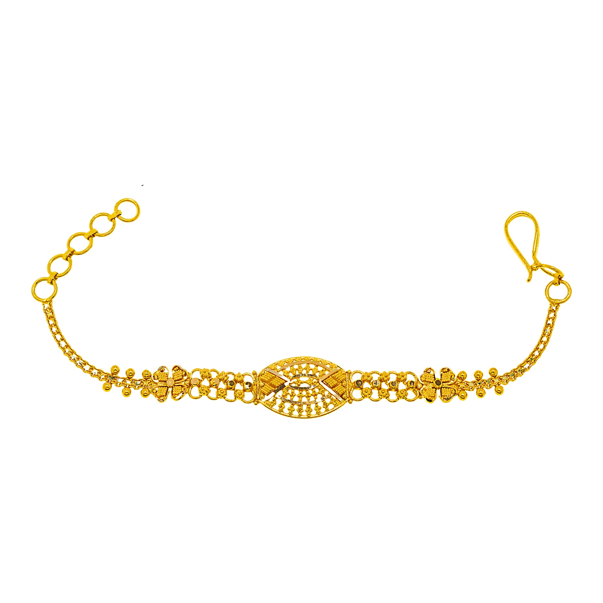 | Celebrate new beginnings with this 22k gold baby bracelet by Virani Jewelers. Designed with a soft, polished finish, it reflects the beauty of Indian gold jewelry in a gentle, wearable form. Perfect for gifting, this gold baby bracelet offers elegance, comfort, and a timeless keepsake to treasure as your child grows. Features • 22K yellow gold Specifications • Minimum Width - 3 millimeters • Maximum Width - 10 millimeters • Length - 4-5 inches • Weight - 4.9 grams |