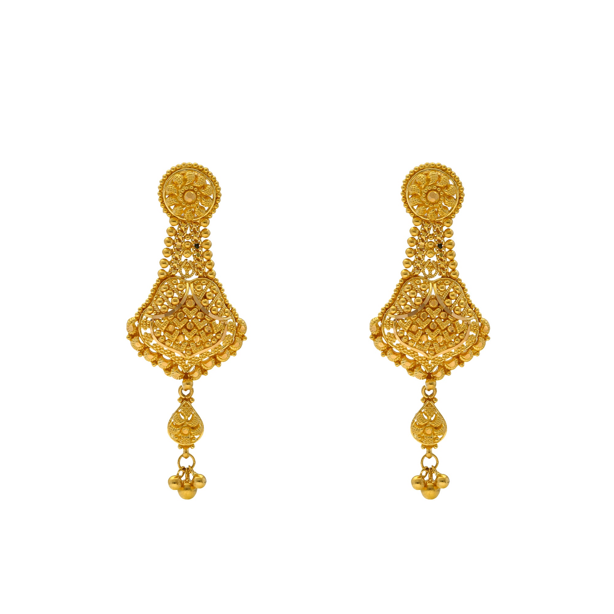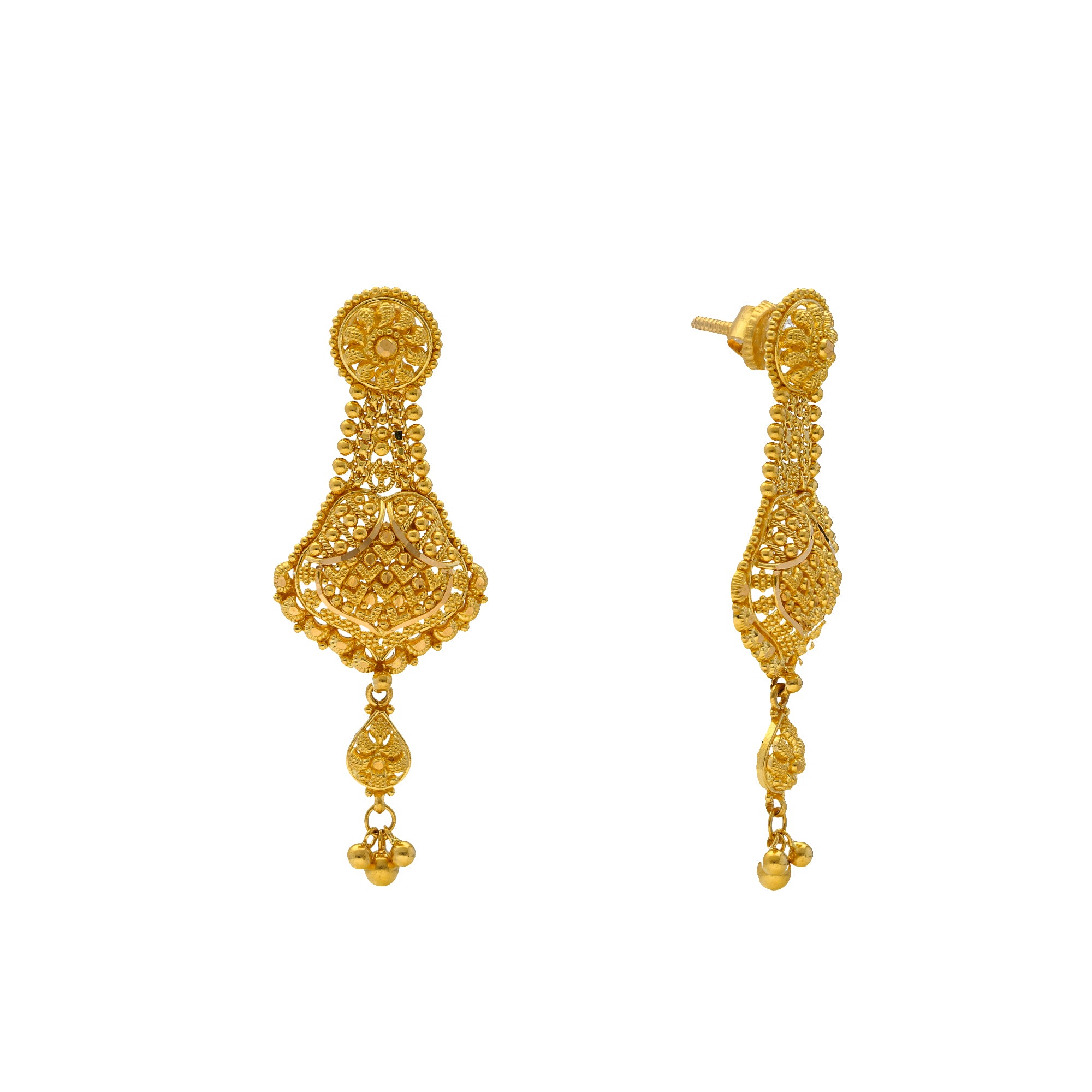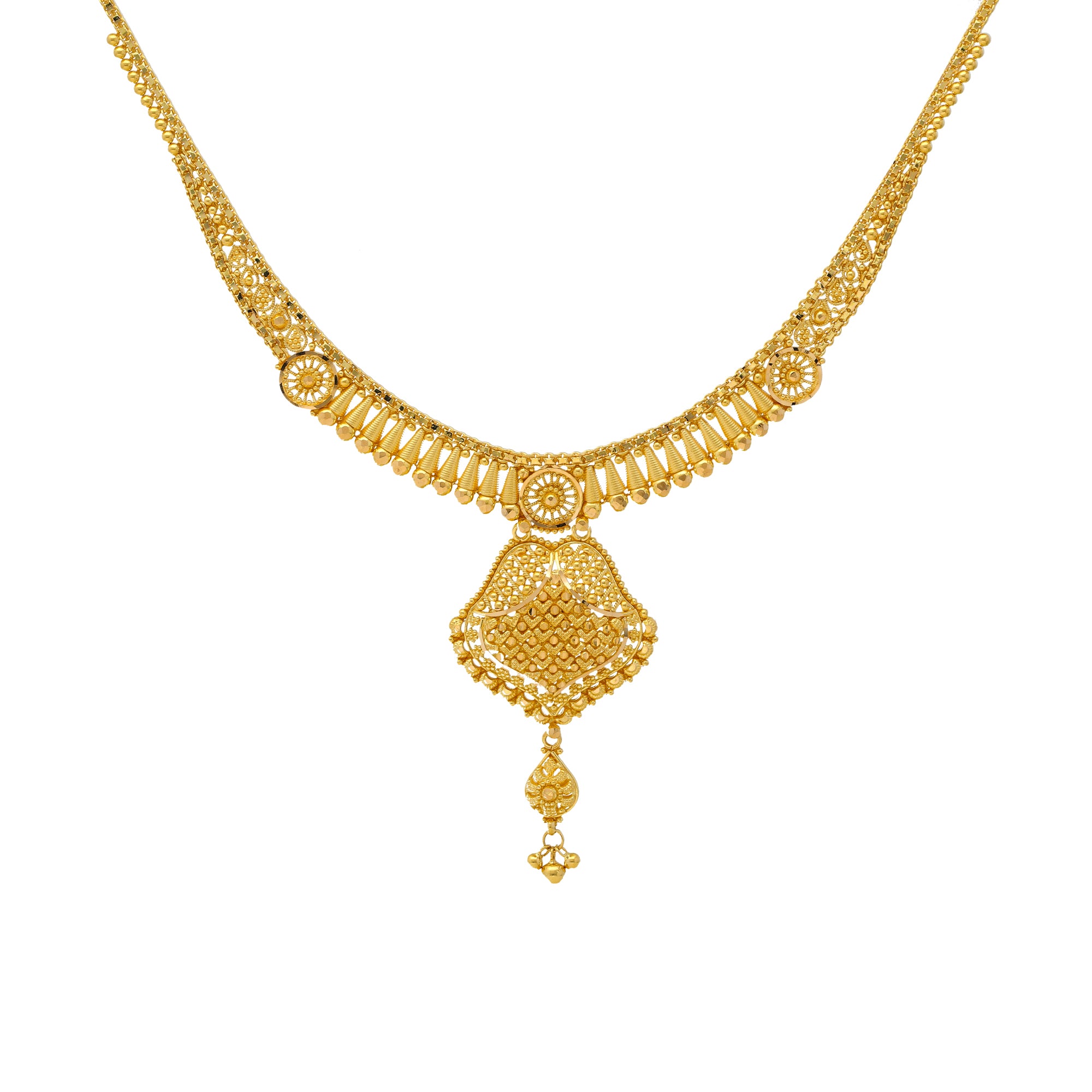 The pendant style design of this 22k gold necklace creates a sophisticated look that enhances the minimal design of this Indian gold jewelry set. The matching gold earrings adorned with exquisite filigree work and beading completes this gold jewelry set by adding a feminine allure.