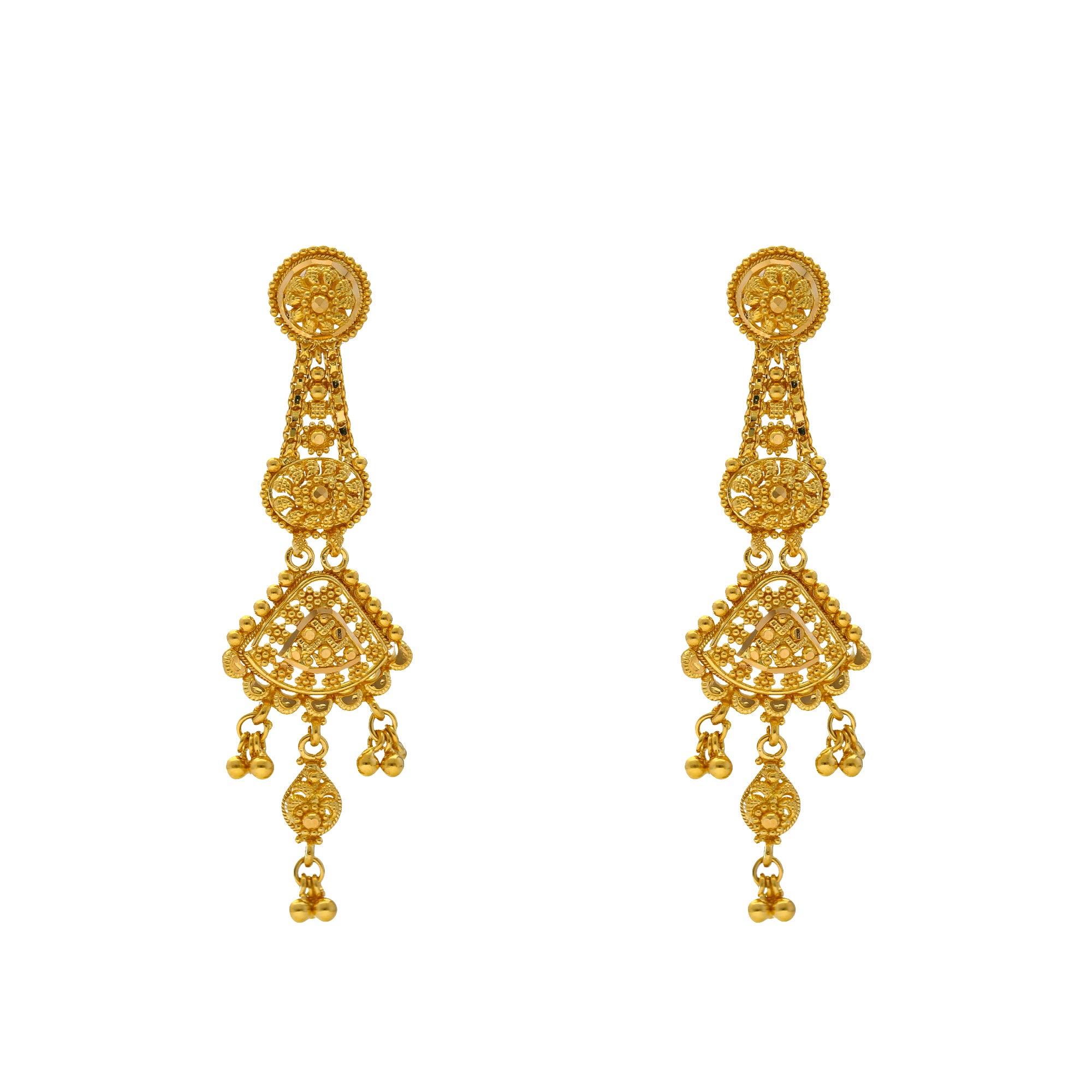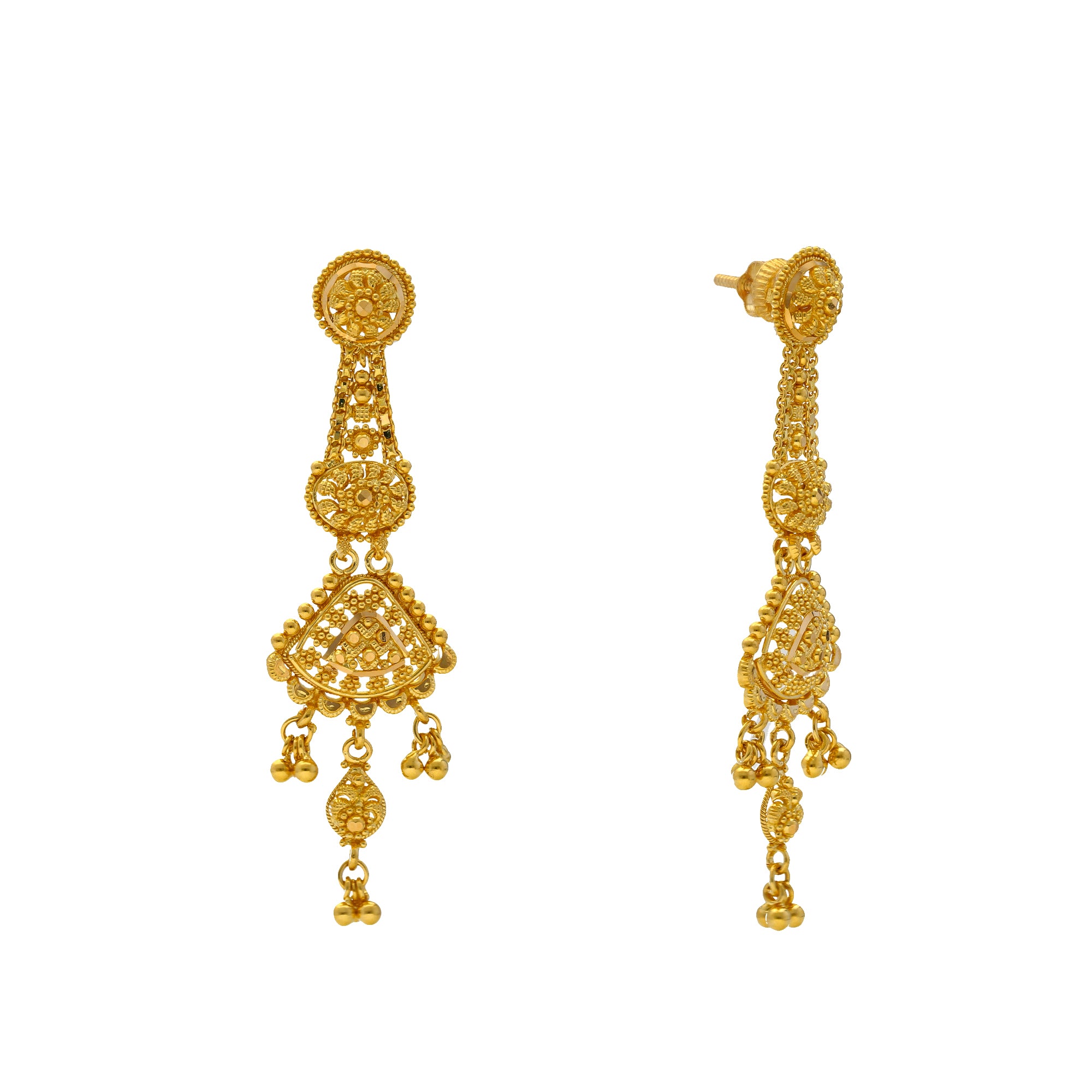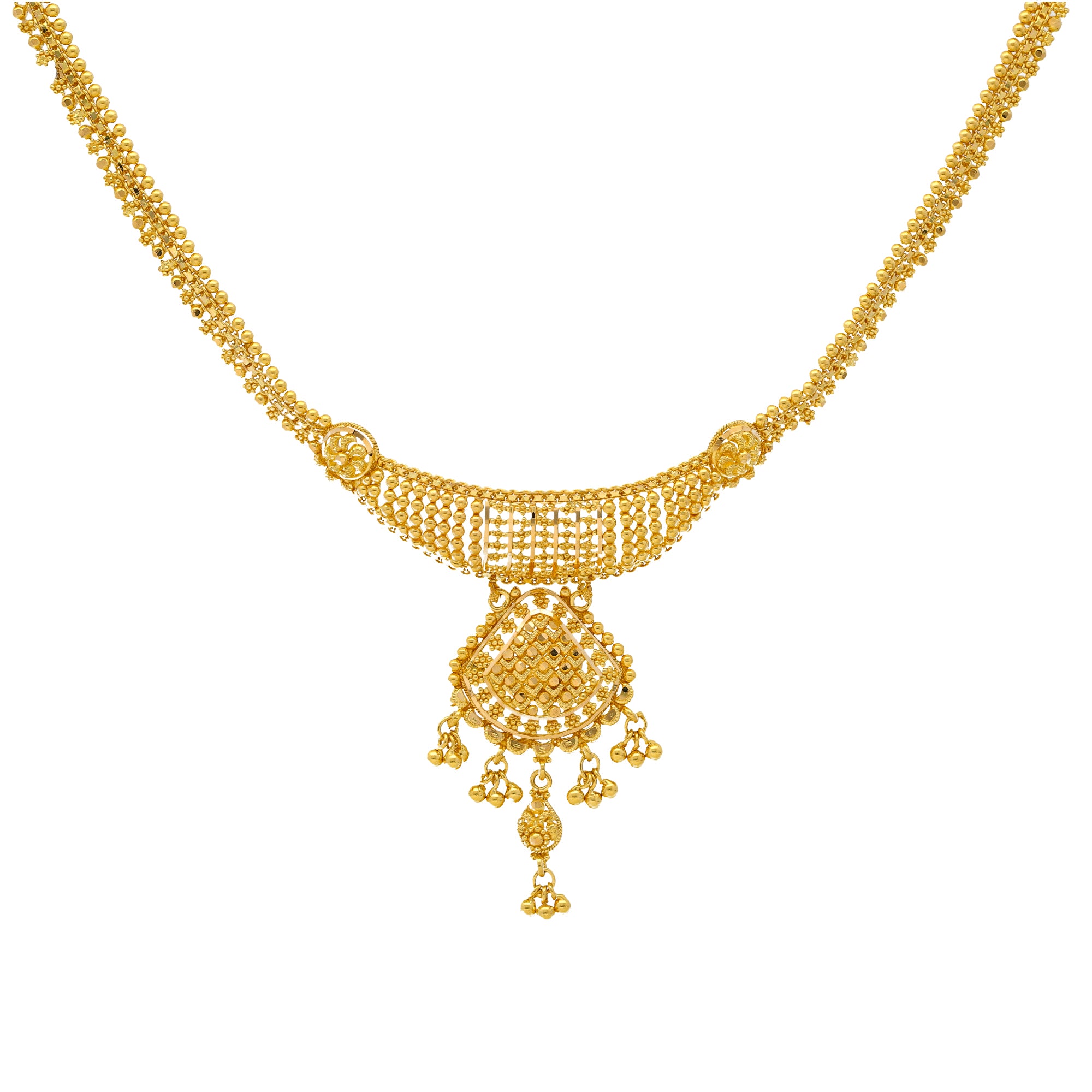 The beaded details and elegant filigree work used to create this stunning 22k gold jewelry set makes it perfect to wear with a wide variety of outfits for special occasions. This charming Indian gold jewelry set weights just 28.3 grams and has an ultra feminine design that is elegant and alluring.