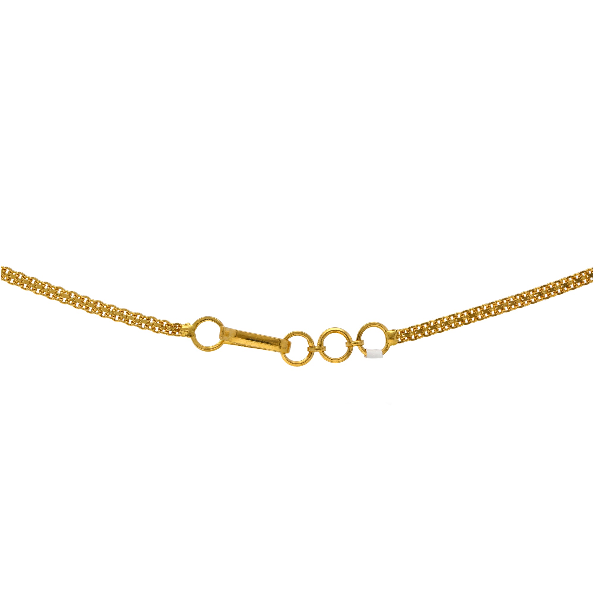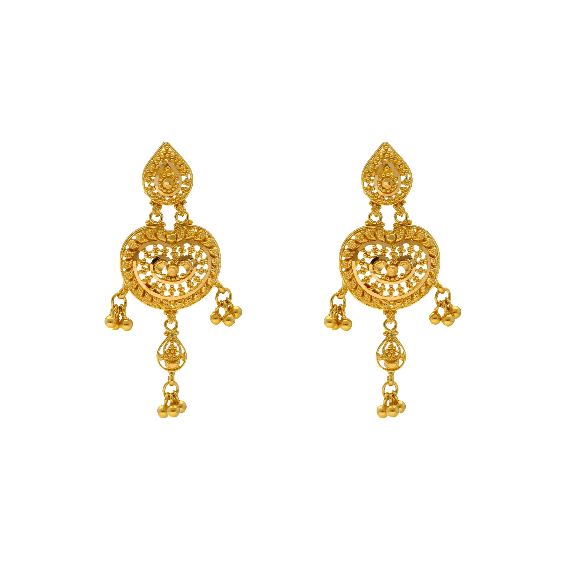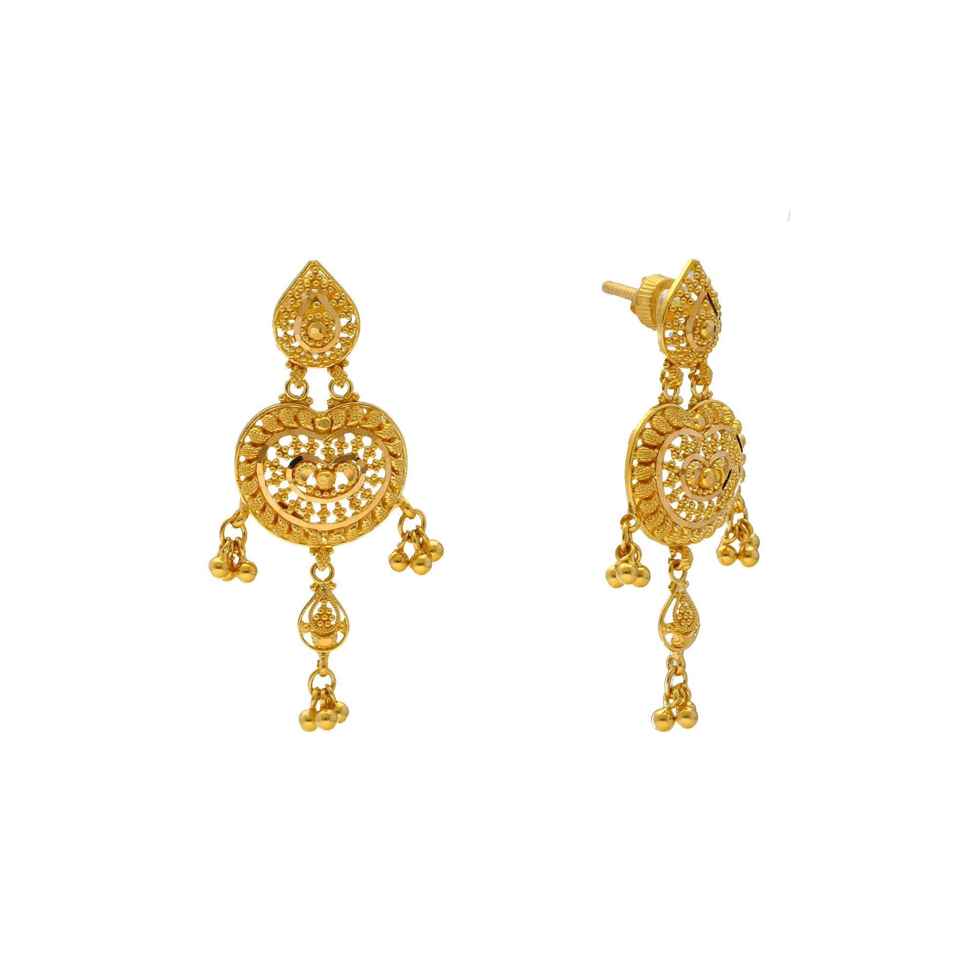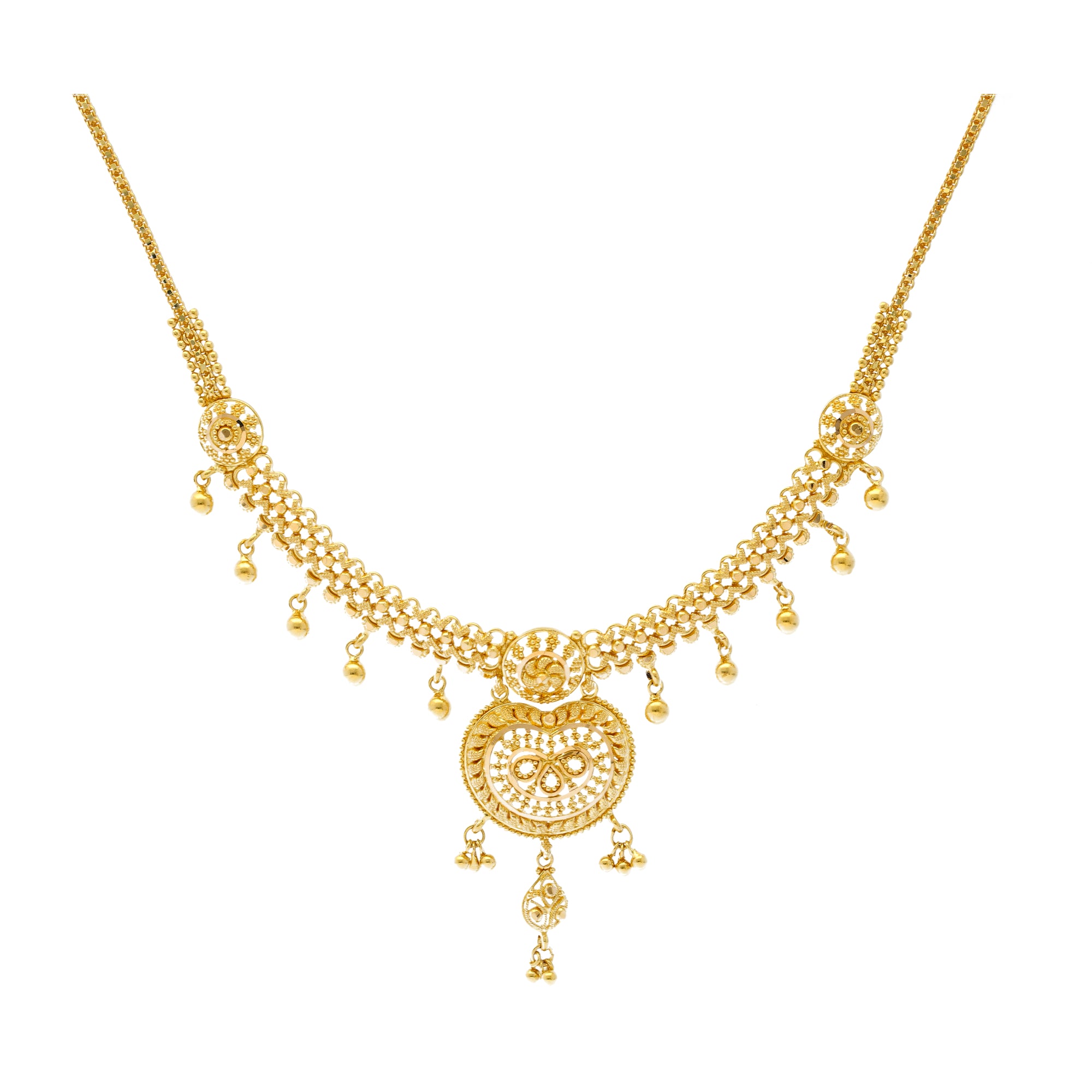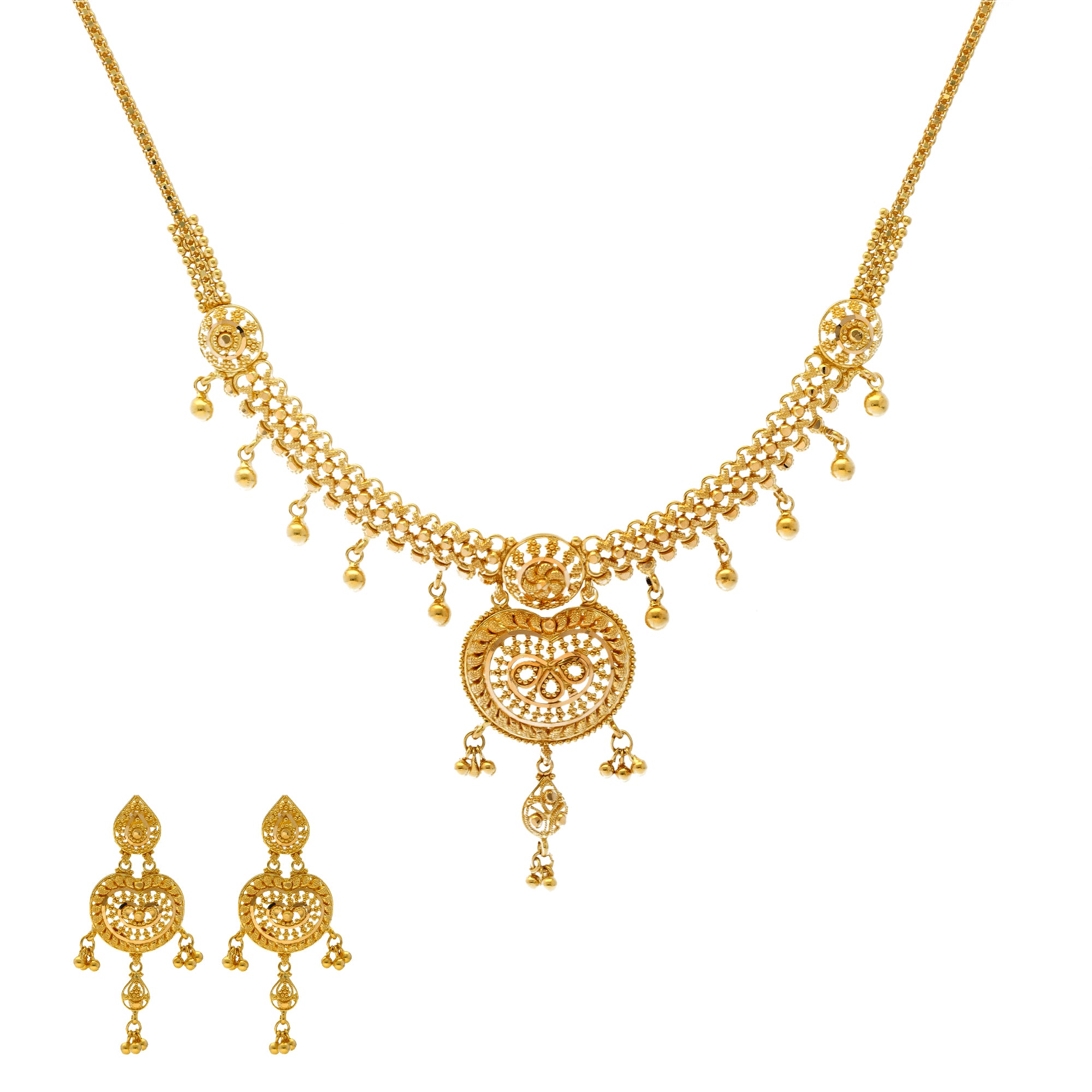 This gleaming gold Indian jewelry set features beading and filigree work along the 22k gold necklace and earrings that creates a stunning look of cultural sophistication. The minimal design and style of this gold jewelry set is enhanced by the charming, heart-like shape of the gold necklace and earrings. Pair this radiant 22k gold jewelry set with formal and traditional Indian attire for a special event or occasion.