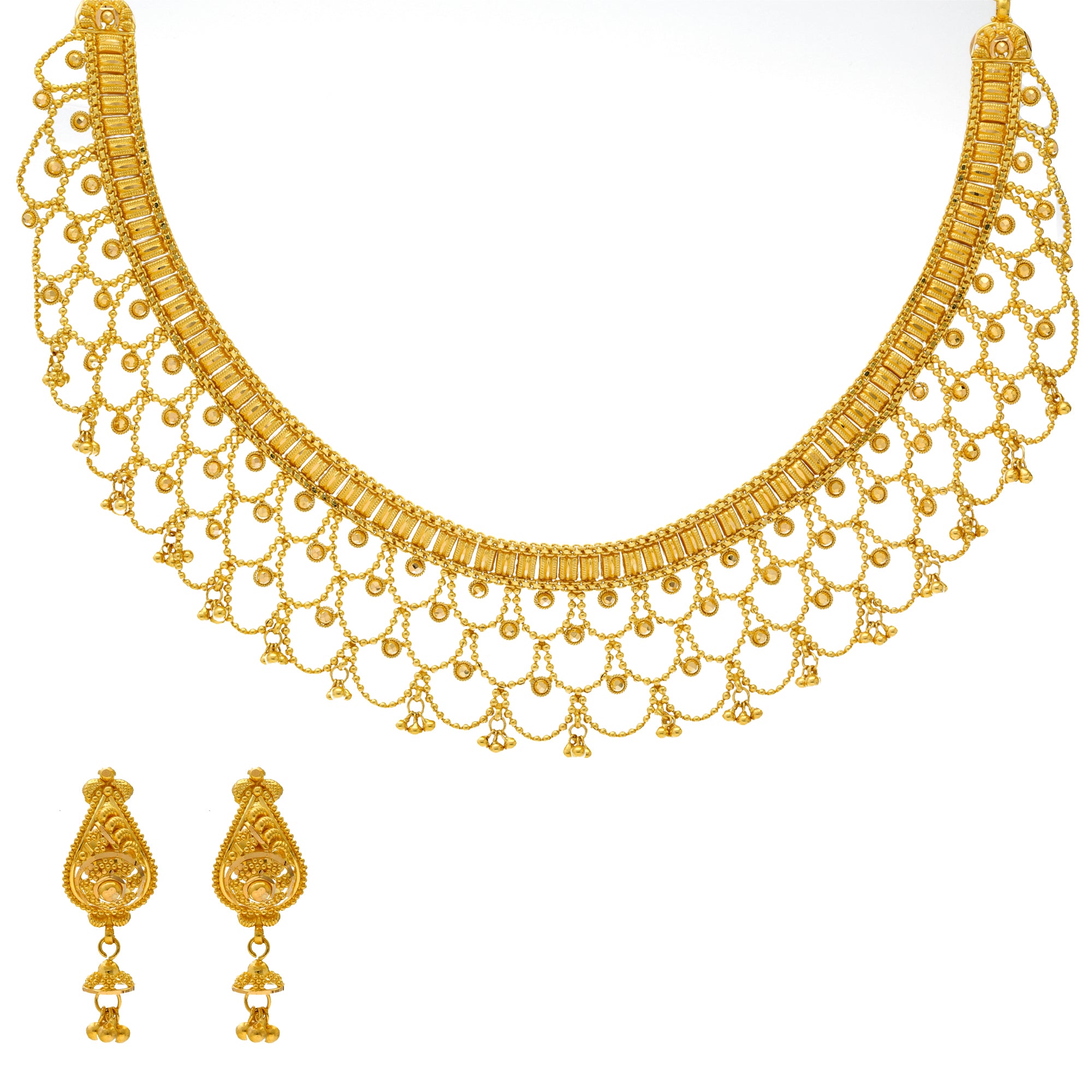 Adorn yourself with the exquisite elegance of this 22k yellow gold necklace and earring set by Virani Jewelers.