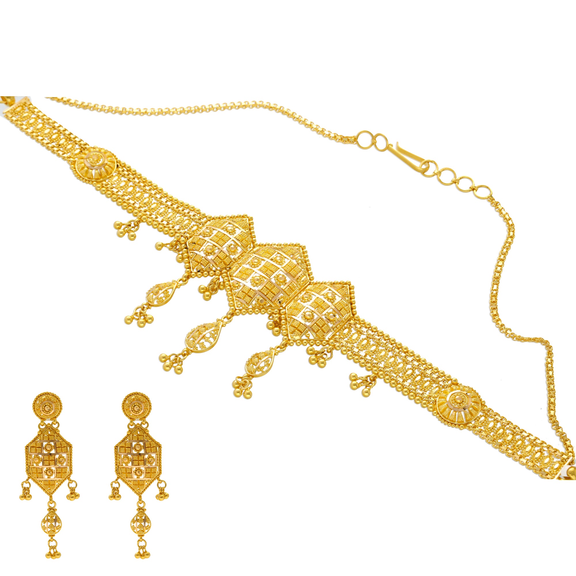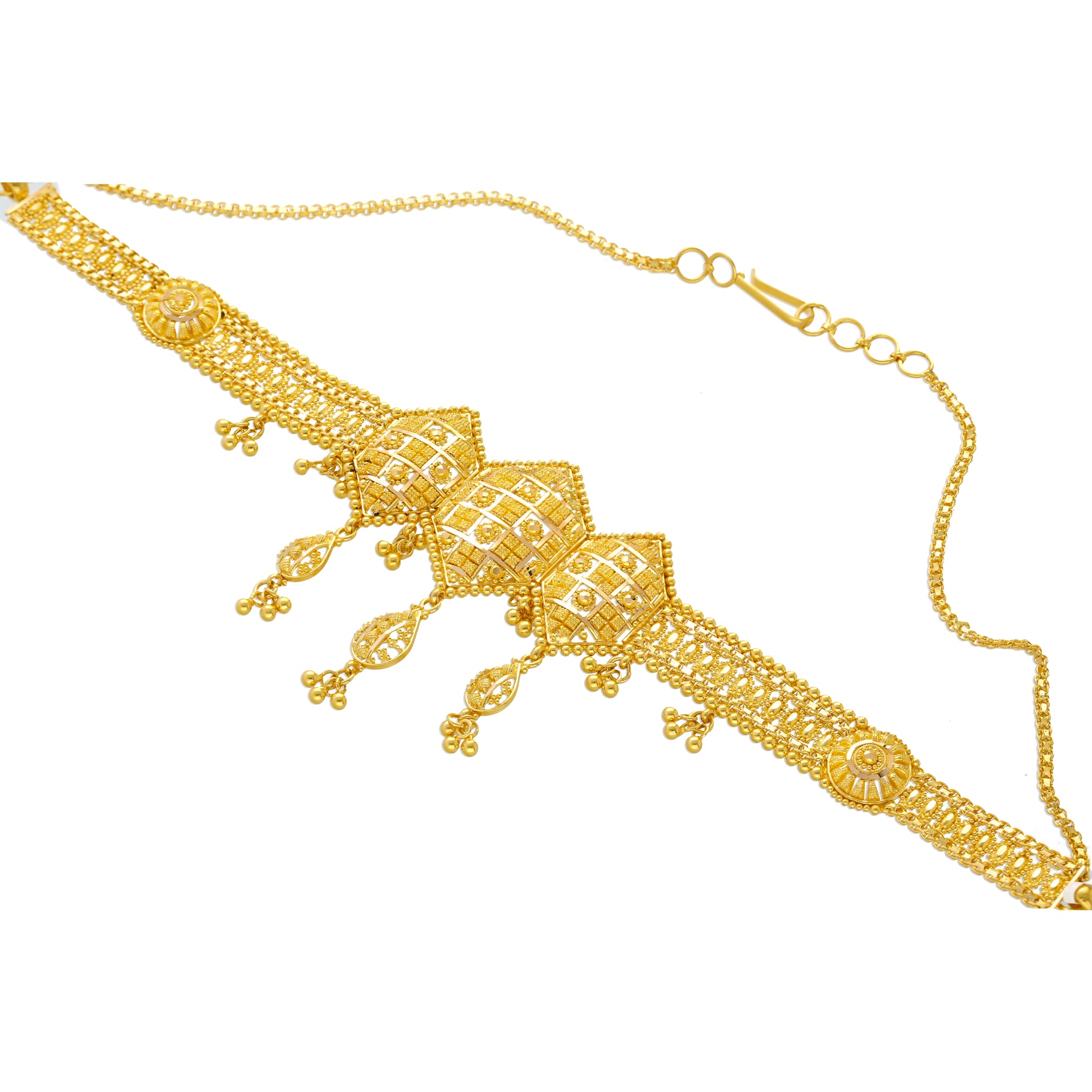 Elegant and sophisticated, this stunning 22k gold choker necklace set blends the tradition of Indian jewelry with modernity and style. The detailed craftsmanship of filigree work and exquisite beading used along the choker and 22k gold earrings make this jewelry set perfect to adorn yourself with for special occasions.