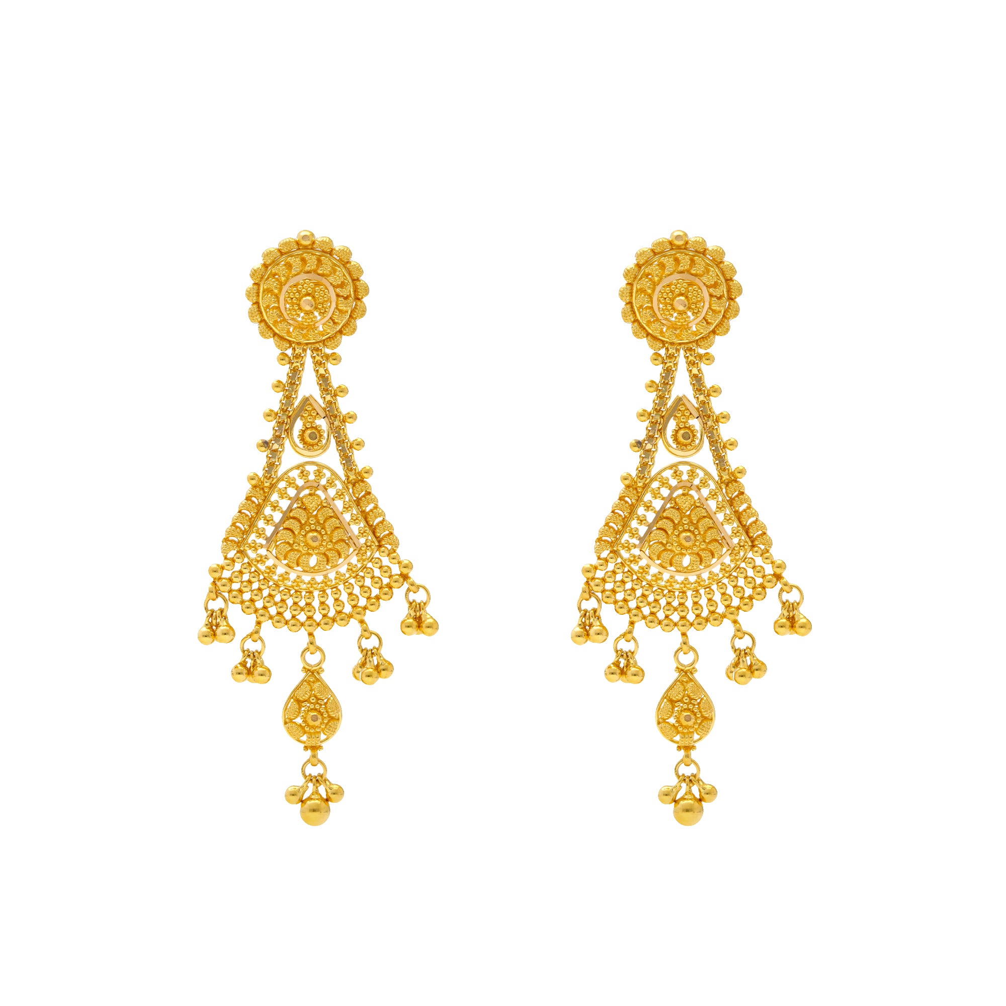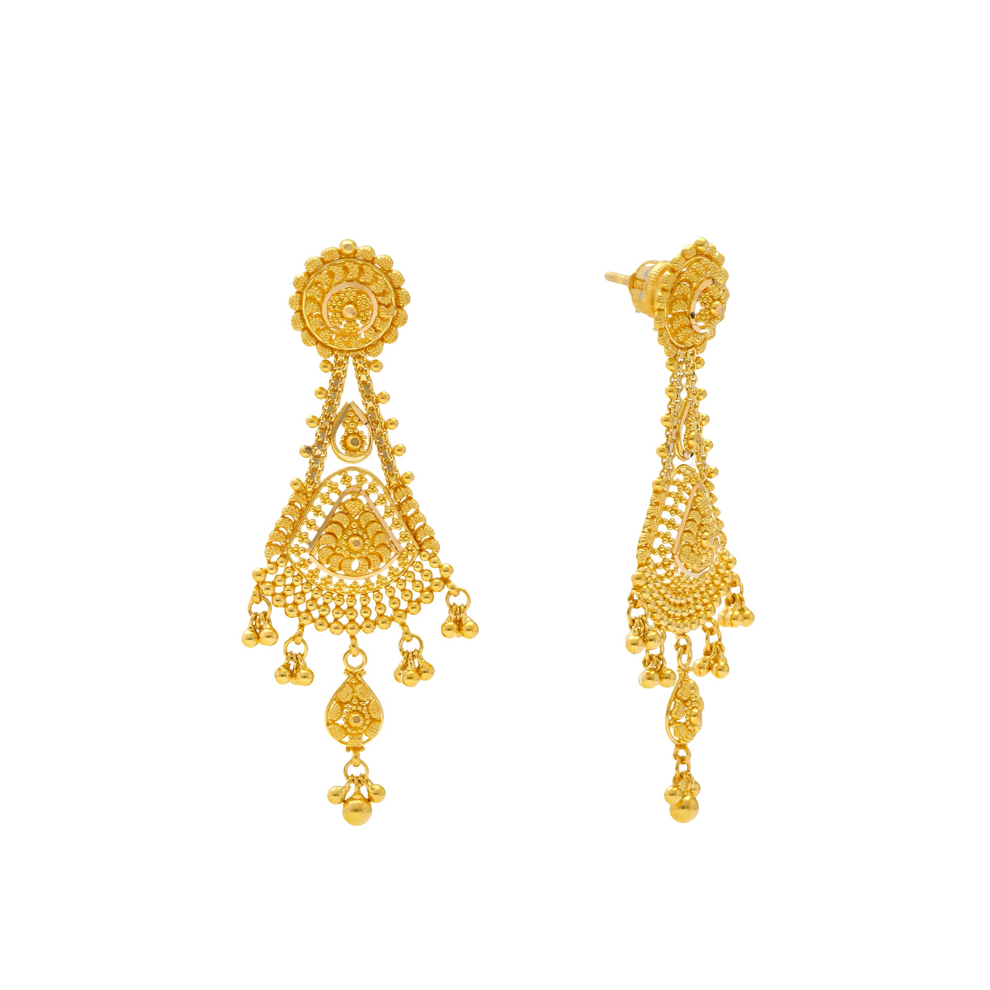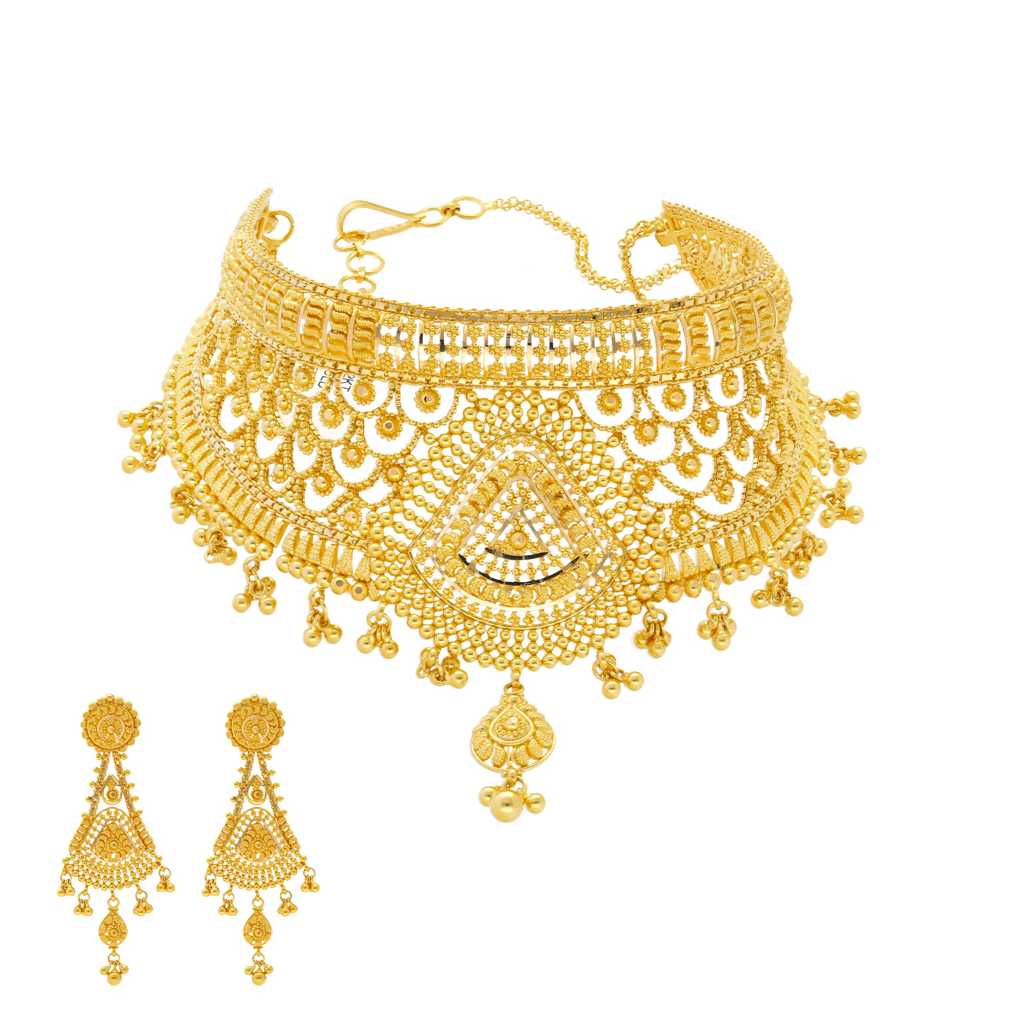 Adorn your neck and ears with this dazzling 22k gold choker necklace and earring set. This luxurious piece of Indian gold jewelry bridges the gap between tradition and modernity. The filigree work and beautiful craftsmanship along the gold choker necklace and matching earrings will add a vibrant shine of golden shimmer to any outfit.