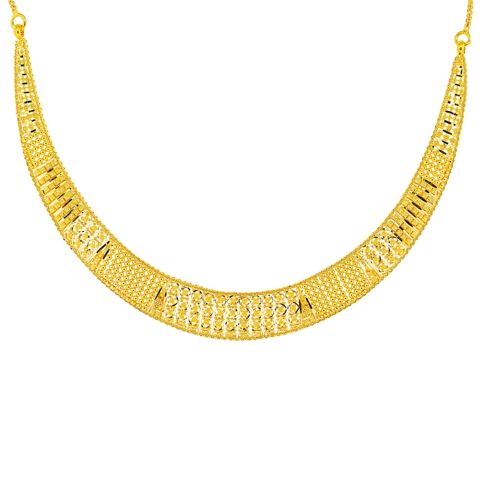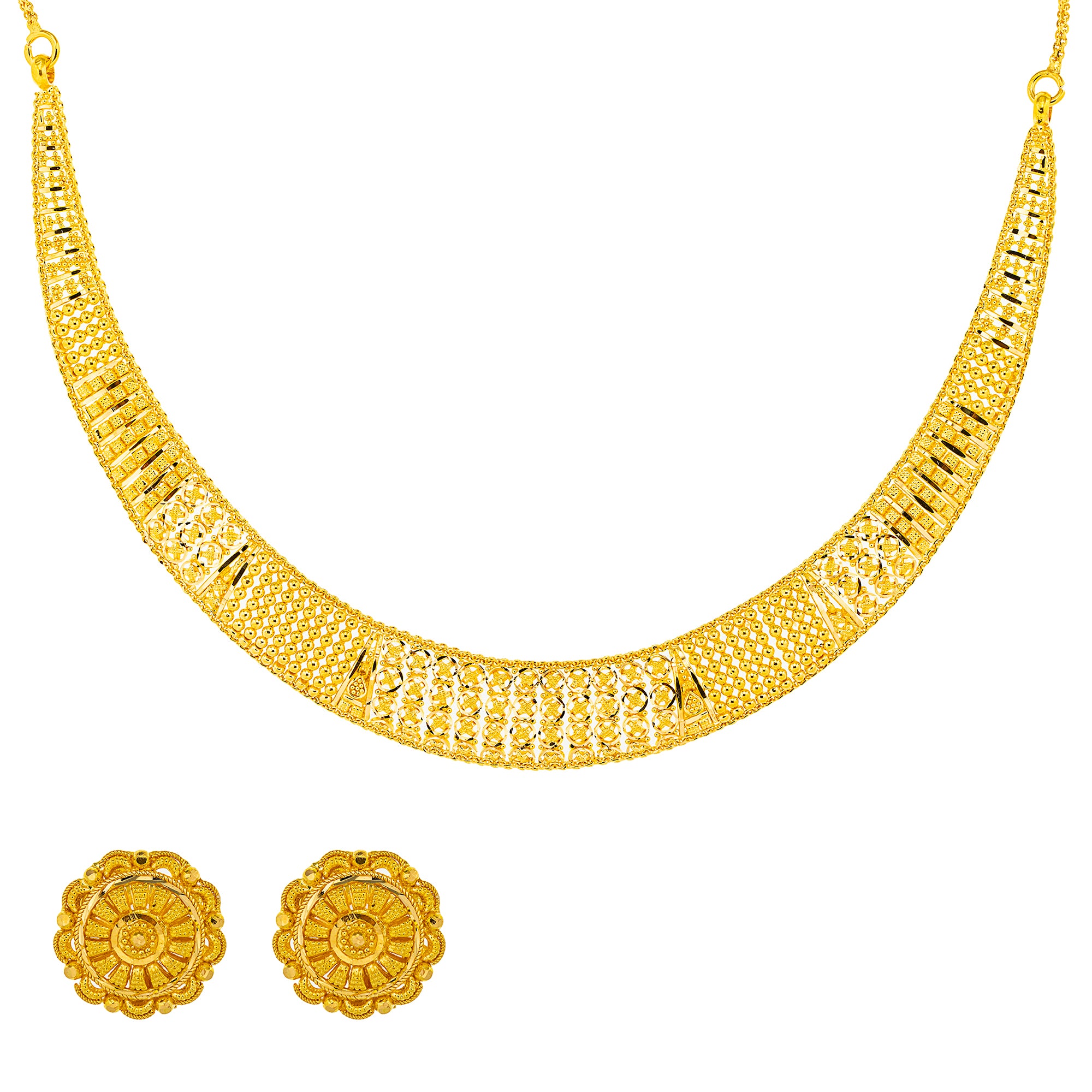 Featuring a stunning blend of intricate patterns and a radiant yellow gold finish, this choker necklace and earring set epitomizes luxury. Perfect for special occasions or adding a touch of elegance to casual wear, this 22k gold jewelry set is a must-have for those who appreciate fine craftsmanship and timeless beauty.