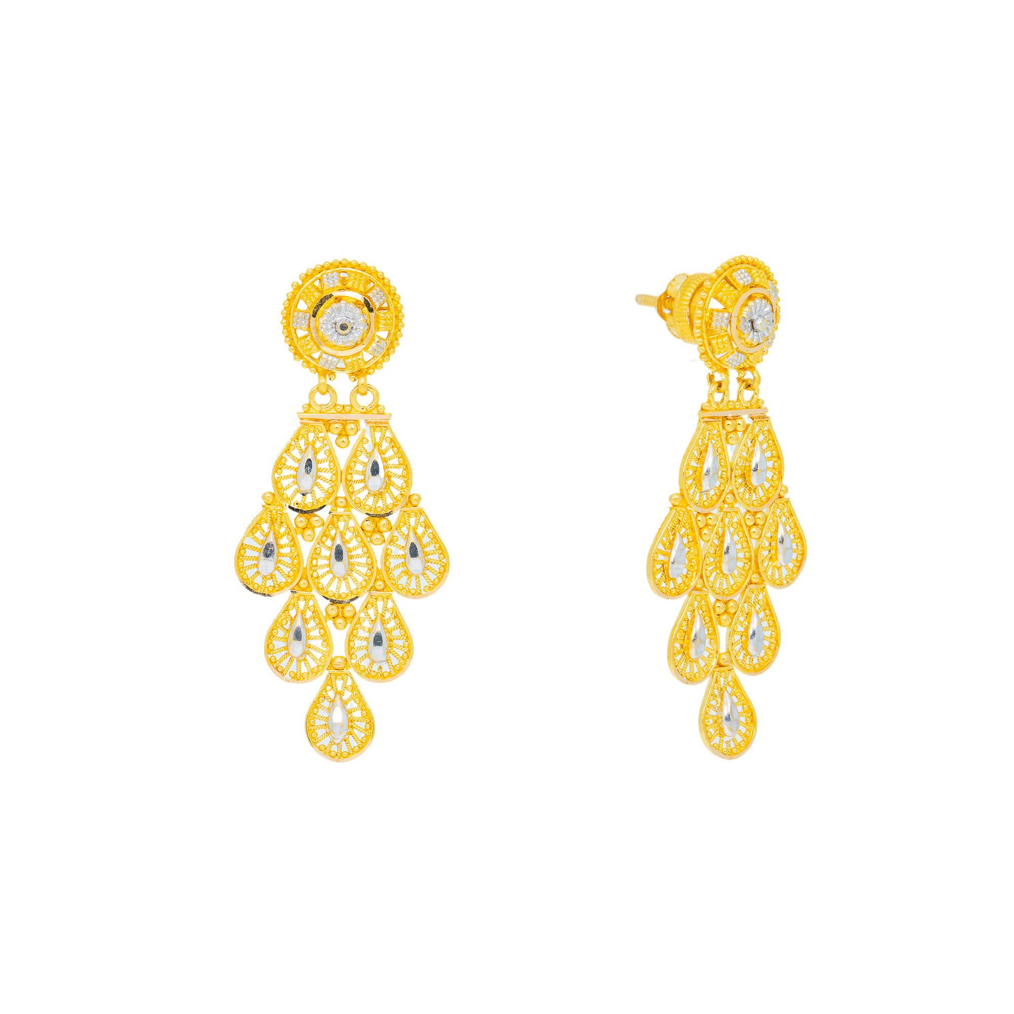 | Luminous 22K yellow gold and intricate artistry define these elegant drop/dangle earrings. Their sculpted detailing creates a graceful balance of texture and shine. Perfect for those who appreciate handcrafted Indian gold earrings designed with the richness of premium 22k gold jewelry. Features • 22K yellow gold Specifications • Minimum Width - 1.5 millimeters • Maximum Width - 20 millimeters • Length - 1.8 inch • Weight - 11.2 grams |