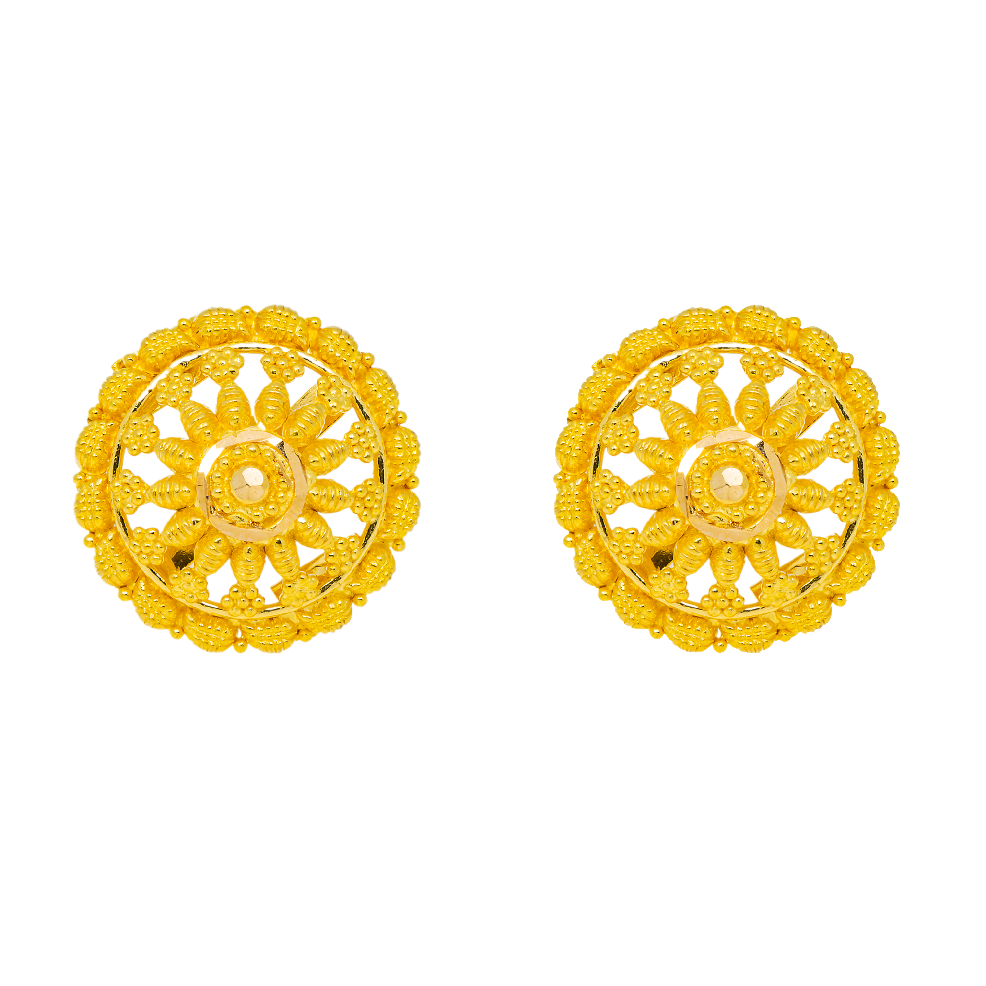 | Crafted with filigree art decorates these 22K yellow gold earrings, creating a refined and feminine silhouette. Their intricate patterns add depth and movement, ideal for enhancing both modern and traditional style. They're a timeless choice for admirers of Indian gold earrings. Features • 22K multi-tone gold Specifications • Minimum Width - 1.5 millimeters • Maximum Width - 14 millimeters • Length - 0.5 inch • Weight - 4.8 grams |