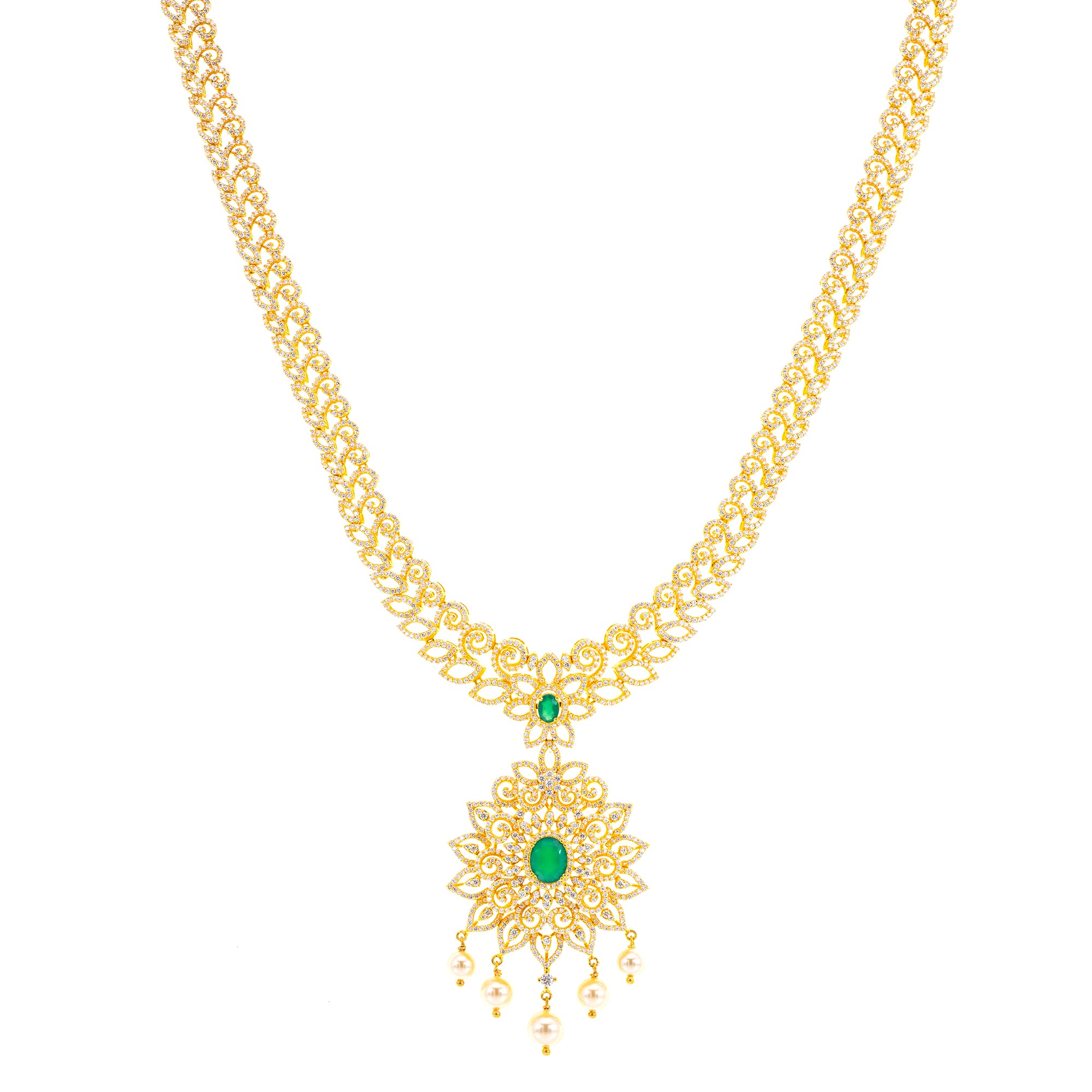This 22k Indian gold necklace from Virani Jewelers features intricate framework and a radiant assembly of cubic zirconia, emeralds, and pearls. Weighing in at 119.8 grams, this fabulous gold necklace has a noticeable beauty and elegance that any woman would love to adorn.