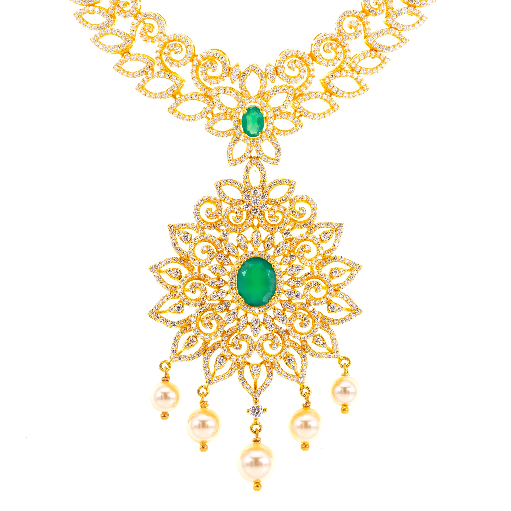 22K Yellow Gold, Emerald, Pearl & CZ Necklace (119.8gm)