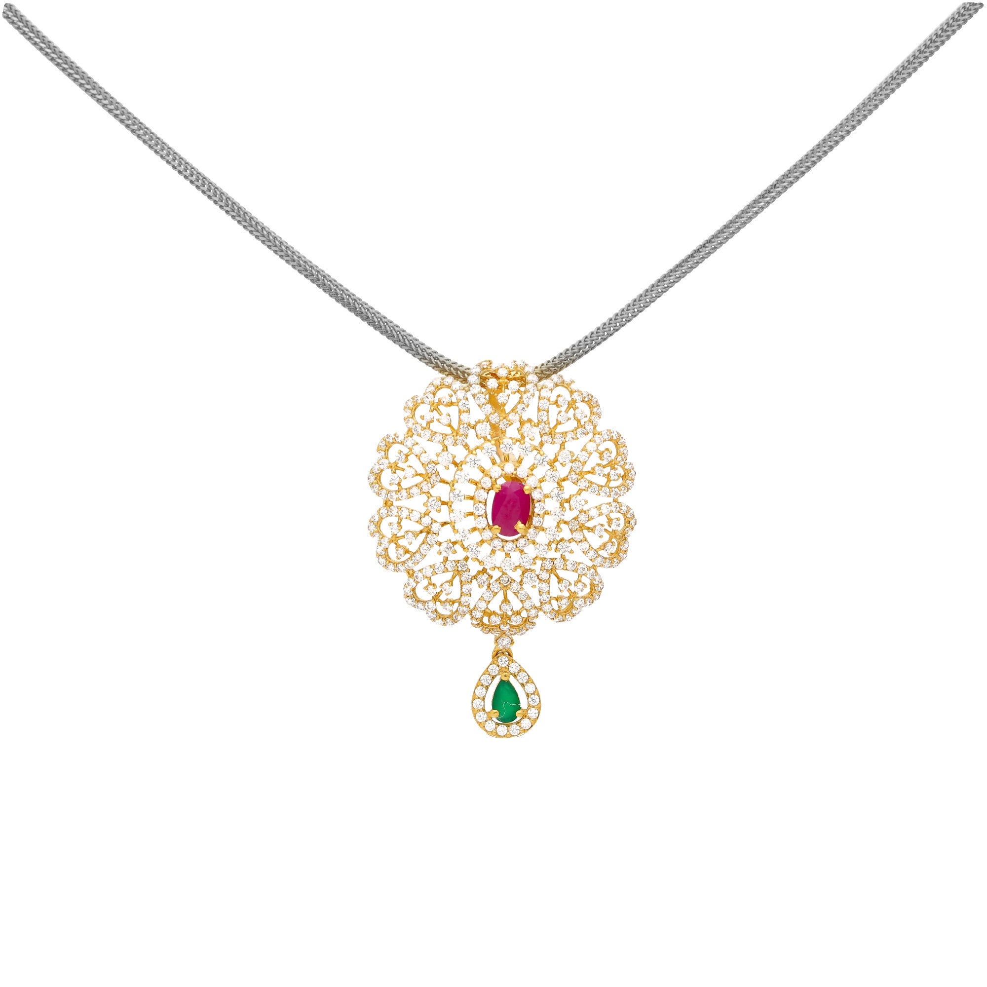 A masterpiece of 22k yellow gold, this emerald, ruby, and cubic zirconia pendant adds a touch of elegance to its design.