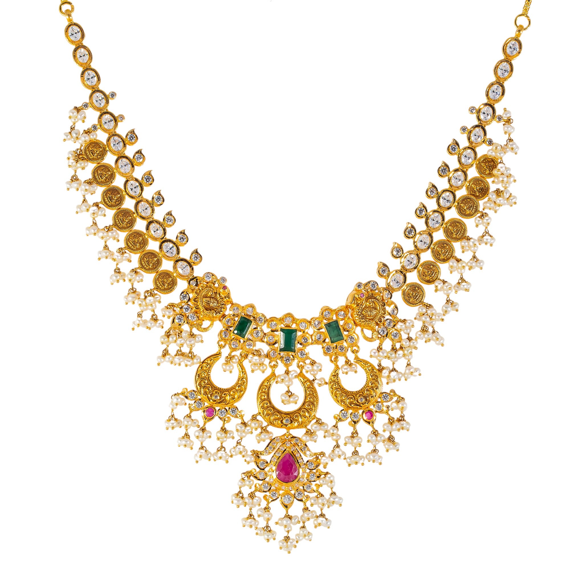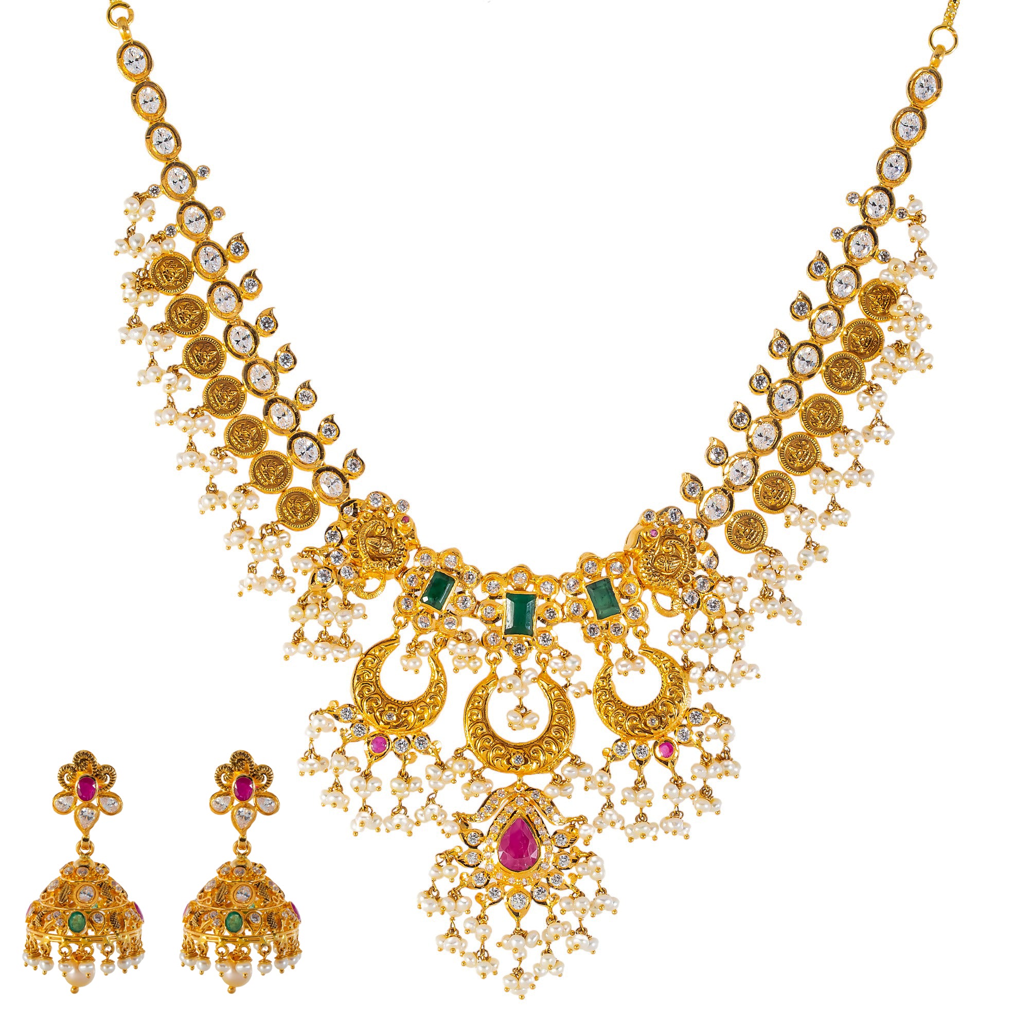 22k Yellow Gold, Emerald, Ruby, CZ & Pearl Temple Necklace Set (62.3gm)
