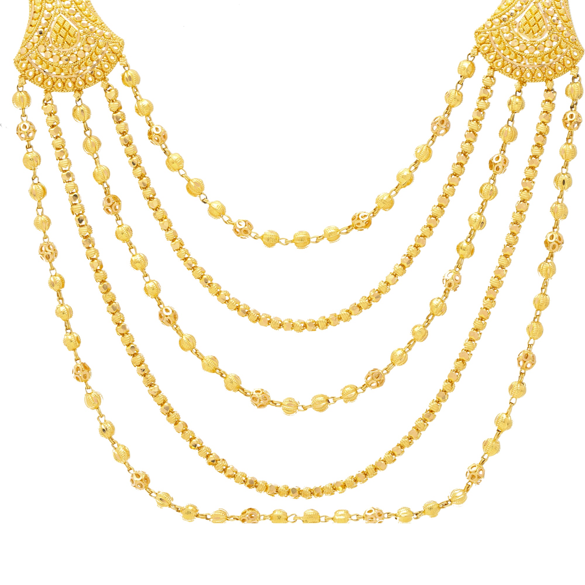 Add a striking regal appeal to your favorite formal looks when you wear this beautiful 22k Indian gold necklace for women! The gorgeous beaded layers and sophisticated design is just what you need to shimmer and shine for special occasions.