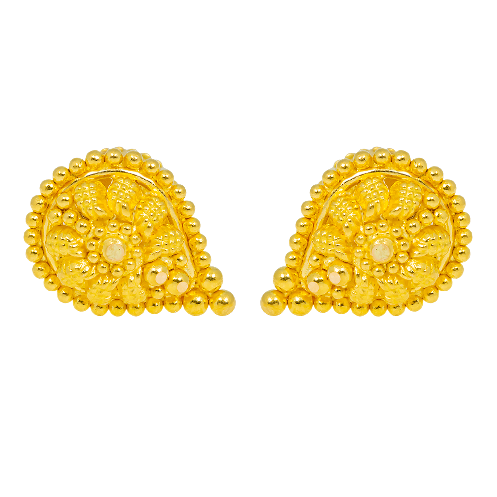 | Crafted with timeless Indian artistry, these 22K yellow gold filigree earrings feature detailed openwork that glows with soft elegance. Their lightweight filigree design ensures all-day comfort, while the refined silhouette enhances both festive and modern looks. An essential piece for lovers of fine 22k gold Indian earrings. Features • 22K yellow gold • Filigree details Specifications • Minimum Width - 1.5 millimeters • Maximum Width - 8.5 millimeters • Length - 0.4 inch • Weight - 2.6 grams |